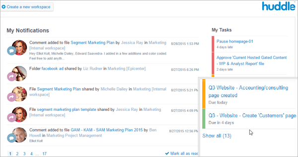 Huddle cũng giữ vị trí hàng đầu trong danh sách của chúng tôi đơn giản vì phần mềm này không chỉ là một cổng thông tin khách hàng mà còn là một trong những giải pháp phần mềm cổng thông tin tốt nhất trên thị trường. Quan trọng hơn, Huddle đã kết hợp thành công sự gắn kết khách hàng với việc quản lý tài liệu, cho phép người dùng tạo không gian làm việc mạng nội bộ cho đội ngũ nhân viên, đối tác và khách hàng.