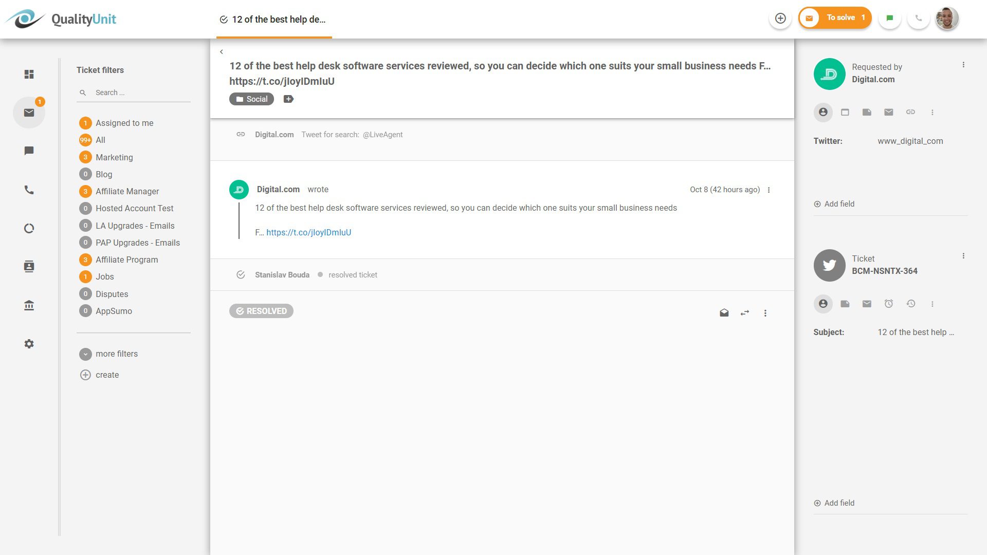Bạn gặp phải một khách hàng đang có thái độ tiêu cực? Hãy xử lý nhanh vấn đề của họ trước khi khách hàng hủy bỏ dịch vụ của bạn! LiveAgent cho phép bạn theo dõi bất kỳ đề cập nào về doanh nghiệp hay thương hiệu của bạn trên Twitter, (ngay cả khi không có ai gắn tag) và từ đó chủ động tương tác với khách hàng. Hãy khắc phục tình trạng này ngay hôm nay!