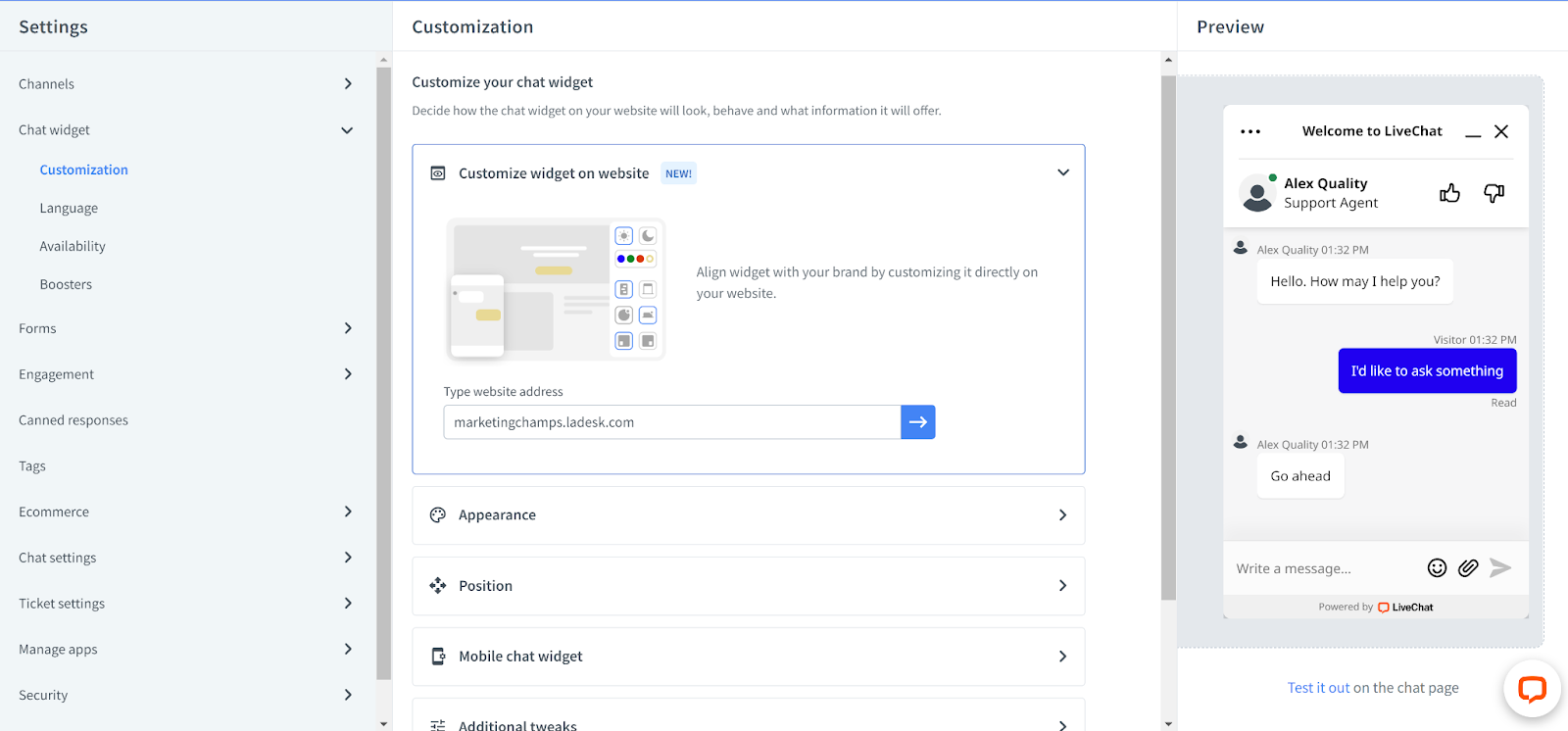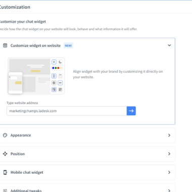 Bạn có thể tùy chỉnh widget live chat của mình trong phần settings. Các tùy chọn khá phong phú, vì vậy nếu muốn sáng tạo, bạn có thể điều chỉnh widget live chat theo sở thích của mình hoặc theo thương hiệu khách hàng của mình. Các lựa chọn bao gồm giao diện của cửa sổ ở chế độ xem phóng to và thu nhỏ, chủ đề sáng hoặc tối, màu chủ đề (hỗ trợ màu tùy chỉnh) và vị trí chat. Ngoài ra còn có tùy chọn để ẩn widget, tùy chỉnh phiên bản di động của widget chat và các chỉnh sửa bổ sung nơi bạn có thể hiển thị logo công ty, ảnh nhân viên, bật hoặc tắt âm thanh, cho phép xếp hạng chất lượng chat và một số tùy chọn khác.