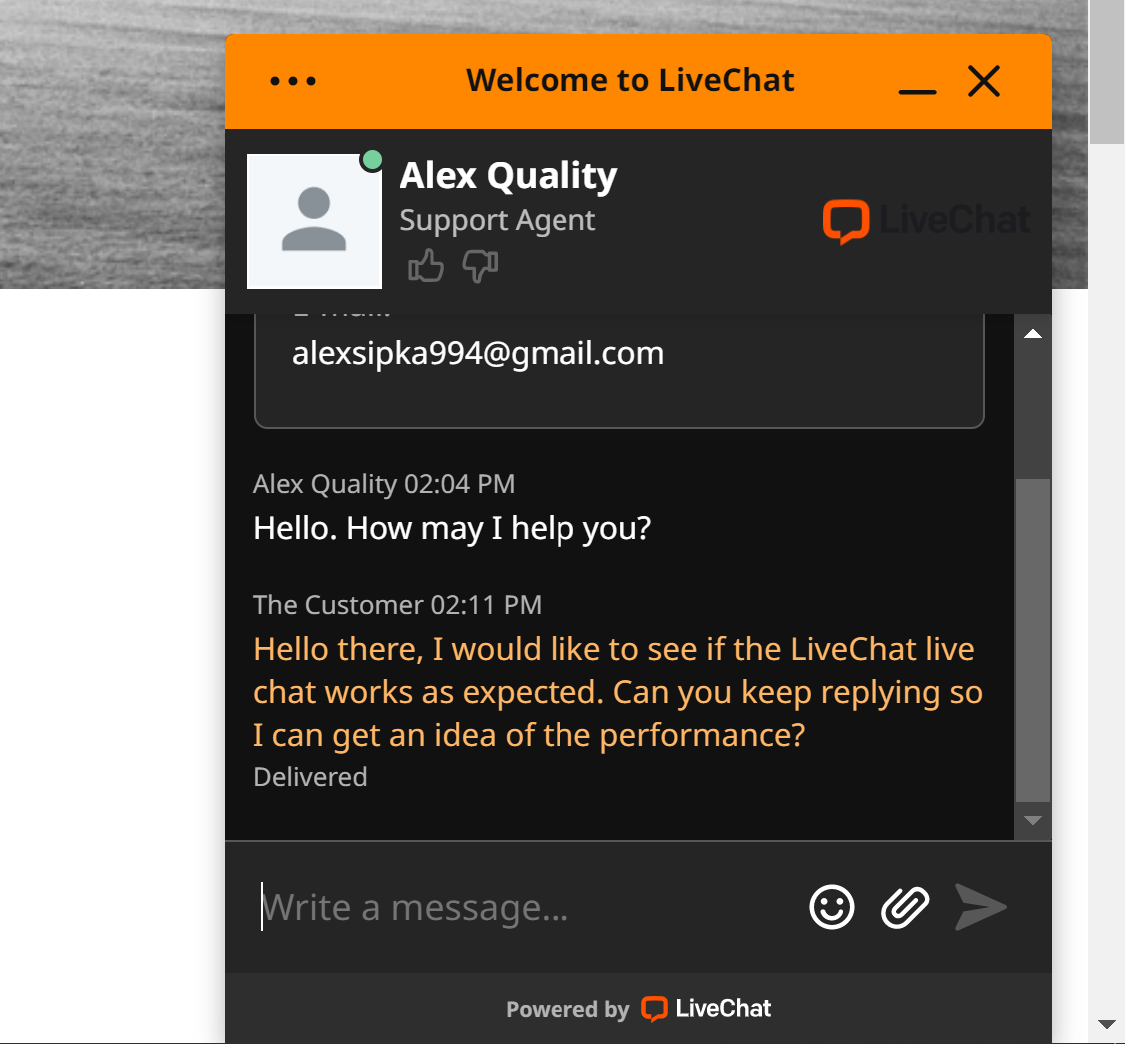 Nhìn chung, widget LiveChat hoạt động rất tốt và tôi hoàn toàn không có bất kỳ phàn nàn nào. Tôi không gặp bất kỳ vấn đề nào với tốc độ và cũng không có lỗi hay sự cố nào. Widget này của LiveChat là một ứng cử viên mạnh mẽ hơn những giải pháp khác khi xét đến hiệu suất.