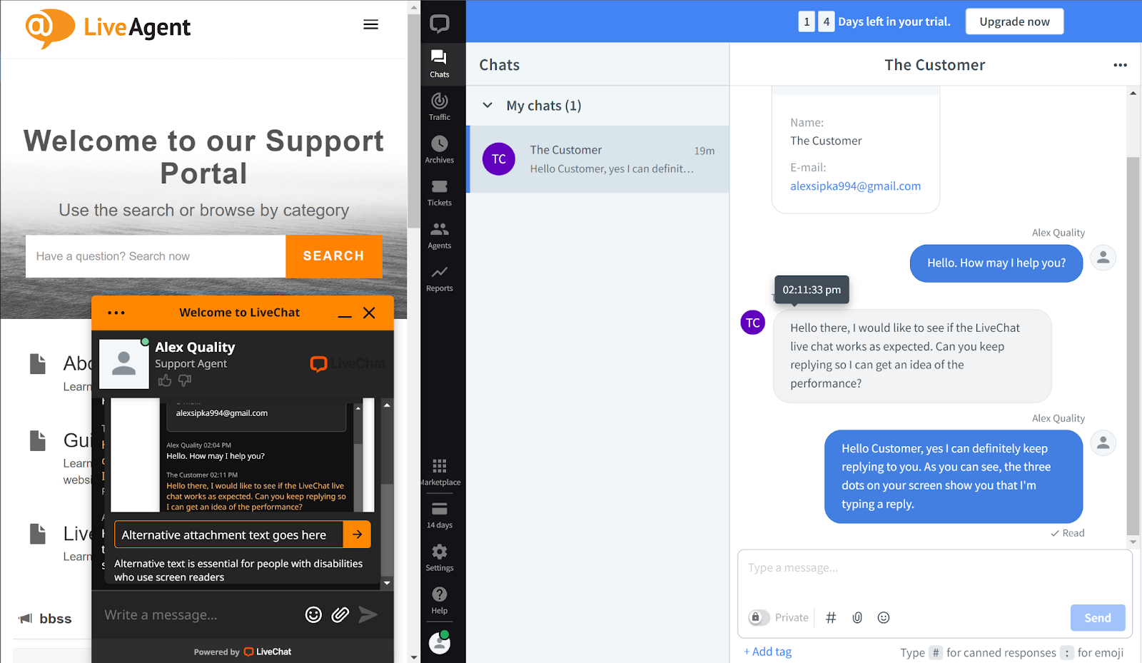 Tôi cũng quan tâm đến tính năng gửi file đính kèm. Khi bạn click vào biểu tượng file đính kèm, bạn có thể chọn và gửi file đi. Bạn có thể xóa file đính kèm bất kỳ lúc nào trước khi gửi. Không giống như xem trước tin nhắn, nhân viên không thể xem file đính kèm nếu nó chưa được gửi đi, vì vậy quyền riêng tư của khách hàng được bảo vệ trong trường hợp họ đính kèm file sai. File đính kèm thậm chí còn cung cấp cho bạn tùy chọn bao gồm một alternative text dành cho người khuyết tật. Một điều rất chu đáo và cực kỳ hữu ích.