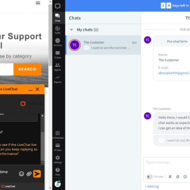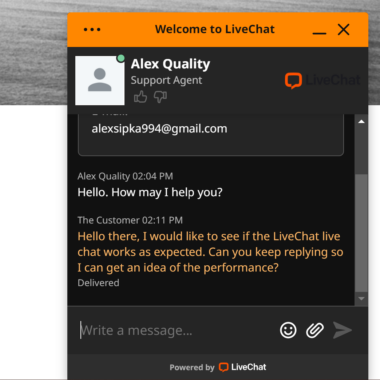 Tôi đã xem xét widget live chat của LiveChat từ cả hai góc độ – vừa là nhân viên sử dụng vừa là khách hàng để có được trải nghiệm đầy đủ và tôi có thể nói rằng mọi thứ đều hoạt động tốt như mong đợi. Khi tôi bắt đầu trò chuyện với tư cách là khách hàng và một tin nhắn tự động chào đón tôi ngay lập tức (bạn có thể tùy chỉnh tin nhắn này trong setting, bên dưới Targeted message). Khi mở bảng điều khiển LiveChat, tôi ngay lập tức nhận được thông báo bằng hình ảnh và âm thanh về một tin nhắn mới đến. Tab trình duyệt cũng liên tục đưa ra các thông báo cho bạn. Cho đến nay, mọi thứ đều hoạt động rất tốt.