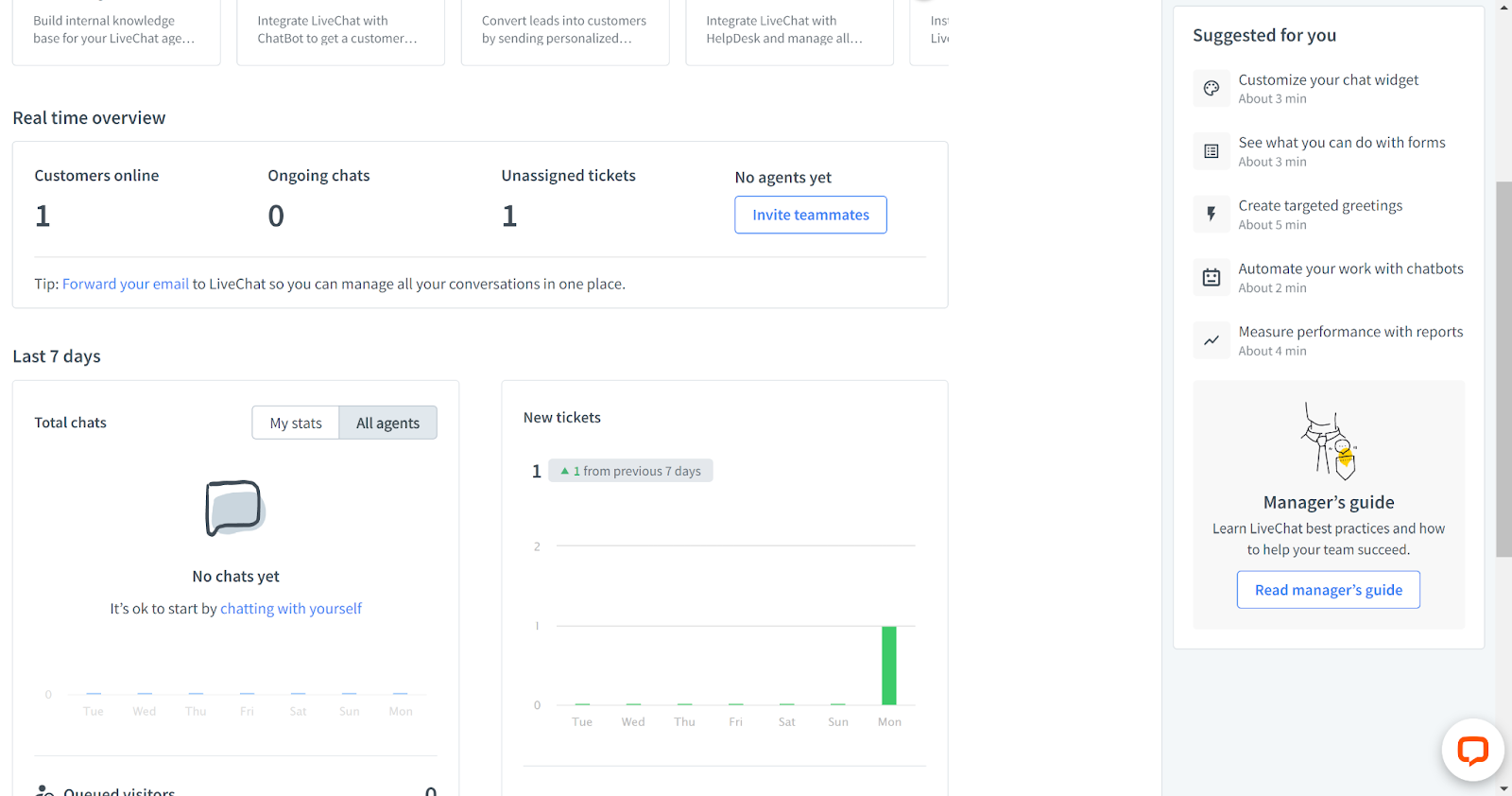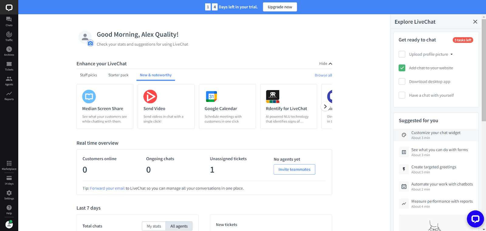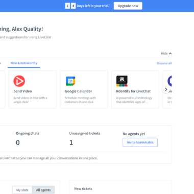 LiveChat là một giải pháp chuyên nghiệp và giao diện thể hiện rõ điều này. Thật dễ dàng để làm quen với hầu hết các công cụ và bạn sẽ không bị lạc mất dấu nhờ các đề xuất dễ dàng trong bảng panel bên phải. Bạn có thể xem các tin nhắn chat, lưu lượng truy cập, ticket, archive lưu trữ, danh bạ … trong menu bảng điều khiển bên trái. Trung tâm của bảng điều khiển hiển thị một số tùy chọn cải tiến và tổng quan nhanh về thống kê live chat theo thời gian thực.