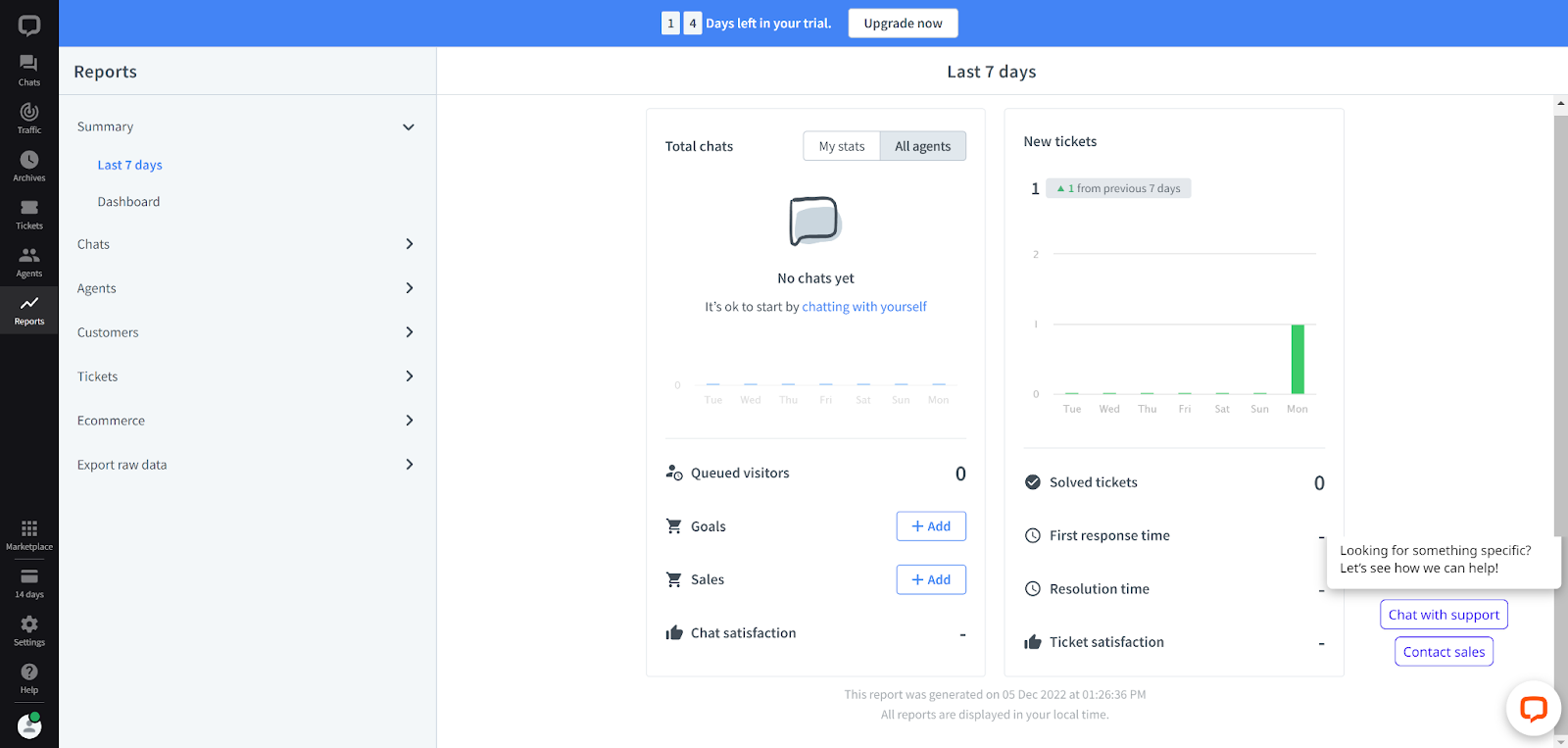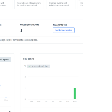 Các tính năng phân tích cung cấp cái nhìn tổng quan nhanh cũng như chuyên sâu về mọi thứ liên quan đến live chat – chat, agent, khách hàng, ticket và thương mại điện tử. Mỗi phần có thể cung cấp cho bạn thêm thông tin và số liệu cụ thể về live chat của mình. Không có gì bị bỏ sót. Tổng quan phân tích cung cấp cho bạn một bản ghi về mọi thứ đã xảy ra trong 7 ngày sử dụng gần nhất.
