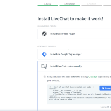 Đăng ký LiveChat rất nhanh chóng. Bạn chỉ cần đăng ký tài khoản của mình và quy trình đăng ký sẽ hướng bạn đến thẳng phần tích hợp widget live chat, nghĩa là bạn có thể triển khai live chat ngay khi khởi động. Tốc độ nhanh một cách đáng ngạc nhiên và LiveChat thậm chí còn cung cấp cho bạn một số tùy chọn tích hợp. Bạn có thể chọn giữa plugin WordPress, Google Tag Manager hoặc cài đặt code live chat theo cách thủ công.