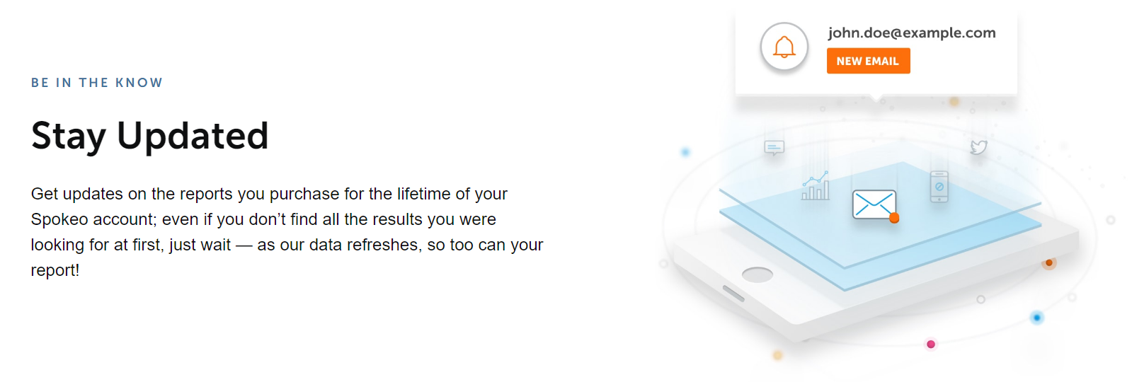 Spokeo cung cấp những thông tin cập nhật về các báo cáo bạn đã mua trước đây, vì vậy bạn sẽ luôn có quyền truy cập vào thông tin mới nhất. Ngay cả khi cơ sở dữ liệu không thể tìm thấy kết quả tại thời điểm tìm kiếm, bạn vẫn có thể xem thông tin và báo cáo mới sau khi cập nhật.