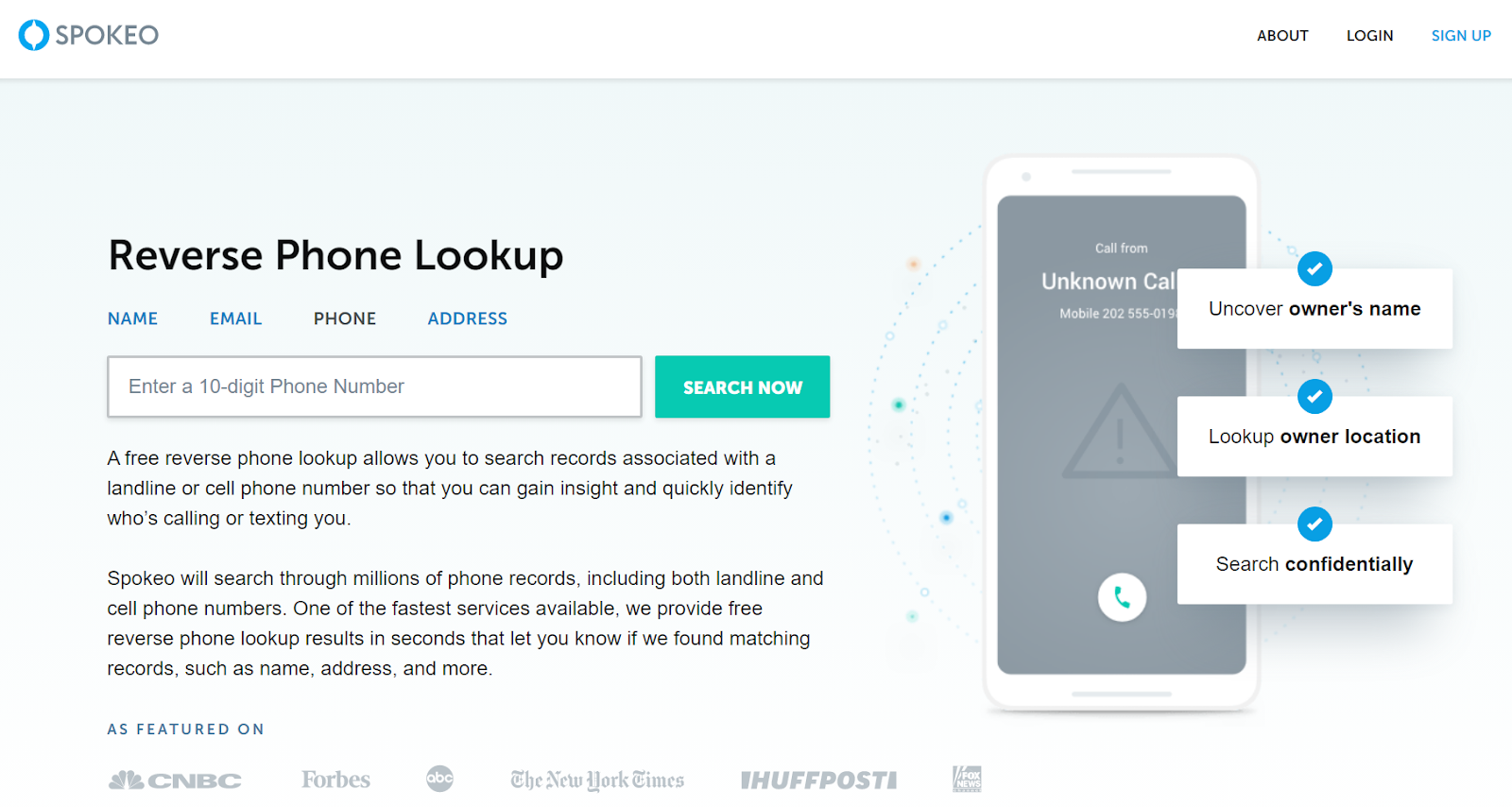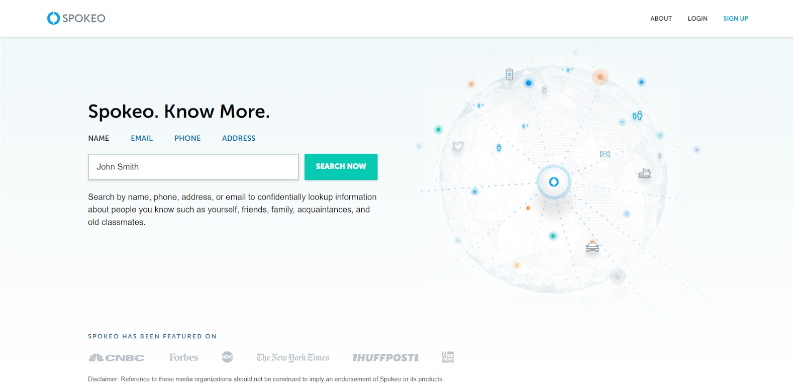 Điều đầu tiên bạn nhìn thấy khi truy cập trang web là bốn tùy chọn tìm kiếm. Bạn có thể tìm kiếm dữ liệu theo tên, địa chỉ, số điện thoại hoặc địa chỉ email. Spokeo có trụ sở tại Hoa Kỳ, nghĩa là nó chỉ chấp nhận số điện thoại được đăng ký tại Hoa Kỳ và tất cả thông tin được giới hạn ở Hoa Kỳ.