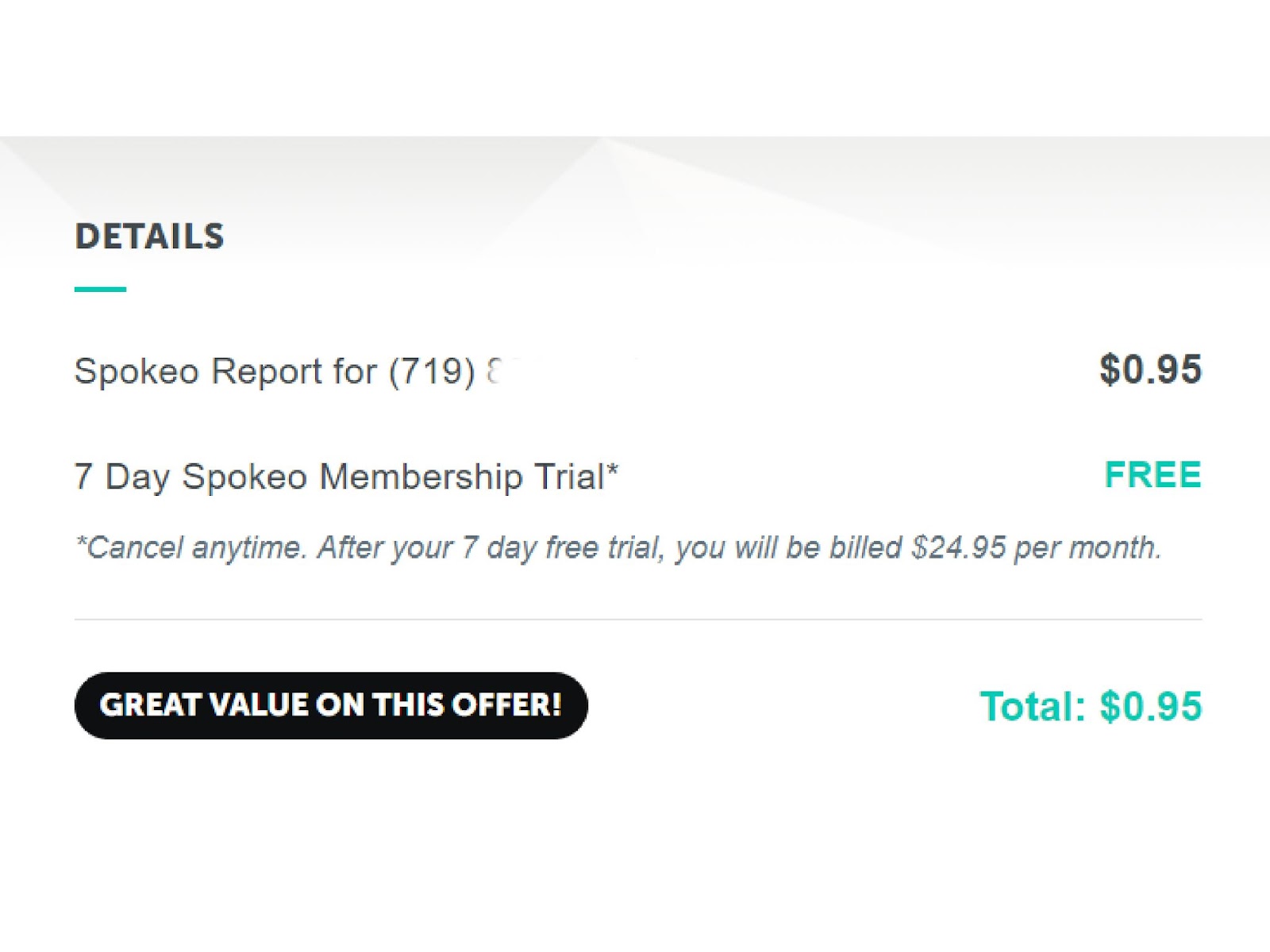 Spokeo có bản dùng thử miễn phí 7 ngày, cộng với một báo cáo trị giá $0.95. Tuy nhiên, bạn cần cẩn thận nếu quyết định đăng ký dùng thử miễn phí vì sau 7 ngày đầu tiên, bạn sẽ bị tính phí $24.95 nếu không đăng ký hủy. Điều này xảy ra là vì bạn phải cung cấp thông tin thẻ tín dụng của mình ngay cả khi bạn đăng ký chỉ để dùng thử miễn phí.