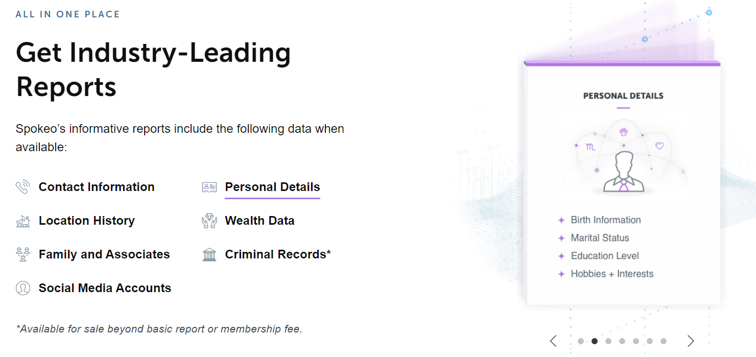 Spokeo cung cấp nhiều tính năng được cho là giúp bạn có thêm thông tin chi tiết về đối tượng bạn đang tìm kiếm. Trang web tạo dữ liệu nhanh chóng và không gặp sự cố. Tuy nhiên, tất cả các thông tin được ẩn đằng sau một bức tường phí (paywall). Họ cung cấp một bản dùng miễn phí. Đây là một cơ hội tốt để dùng thử dịch vụ của họ trước khi cam kết sử dụng.