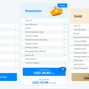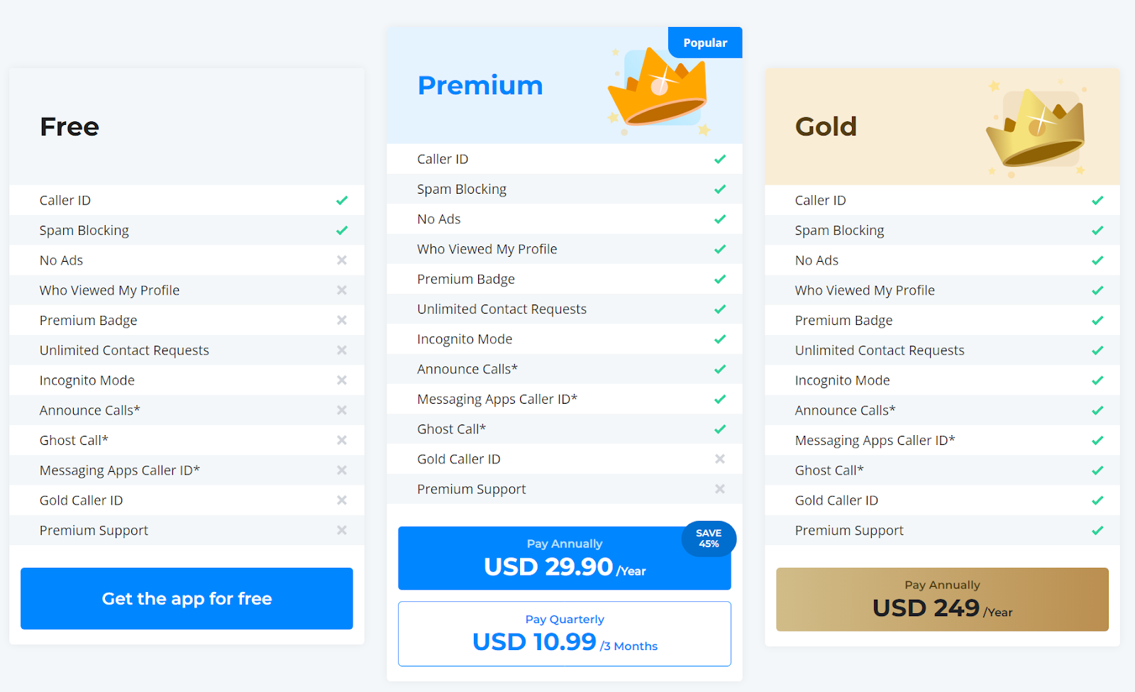 Truecaller cung cấp ba gói phí khác nhau. Mỗi gói bao gồm các tính năng nâng cao khác nhau để mang lại trải nghiệm người dùng tốt hơn. Tiếc là không có bản dùng thử miễn phí nào cho các phiên bản trả phí và không hoàn lại tiền nếu bạn hủy bỏ việc đăng ký của mình.