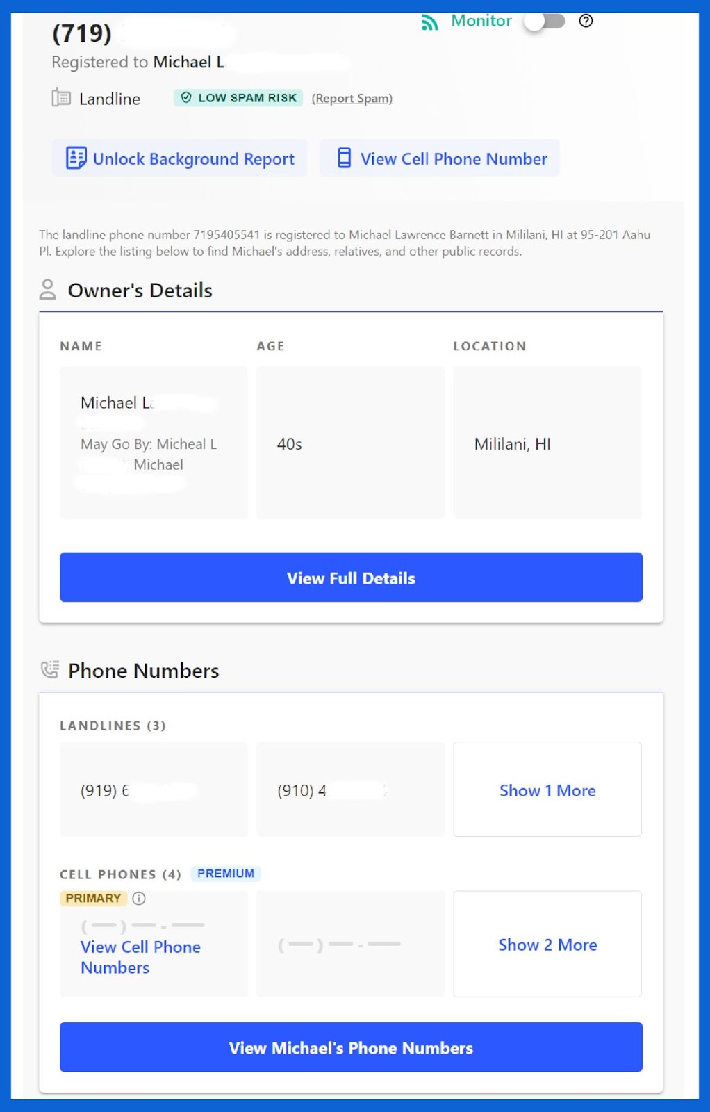 Bạn có thể tìm kiếm miễn phí số điện thoại di động, tại nhà riêng và doanh nghiệp trên trang web của Whitepages. Thông tin có thể khác nhau tùy thuộc vào loại hình của số điện thoại mà bạn đang tìm kiếm. Đối với đầu số hộ gia đình hoặc doanh nghiệp, bạn có thể tìm thấy miễn phí tên, địa chỉ hoặc các doanh nghiệp có liên quan của người gọi. Nếu bạn tìm kiếm số điện thoại di động, sẽ cho ra ít dữ liệu miễn phí hơn. Bạn sẽ có thể tìm thấy thông tin như tiểu bang hoặc thành phố được liên kết với số điện thoại và nhà cung cấp dịch vụ viễn thông. Tuy nhiên, để truy cập thêm thông tin như tên, địa chỉ, người thân .. bạn phải nâng cấp lên gói có phí.