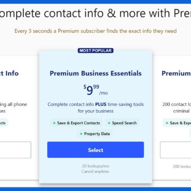 Gói thứ ba có phí $29.99/tháng, bao gồm tối đa 200 lượt tra cứu mỗi tháng, 20 hồ sơ tư pháp và công khai cũng như tất cả các tính năng khác có trong gói Premium Business Essentials. Cũng giống như những gói khác, bạn có thể thanh toán hàng tháng hoặc hàng năm, lên tới $179.88 và tương đương $14.99/tháng.