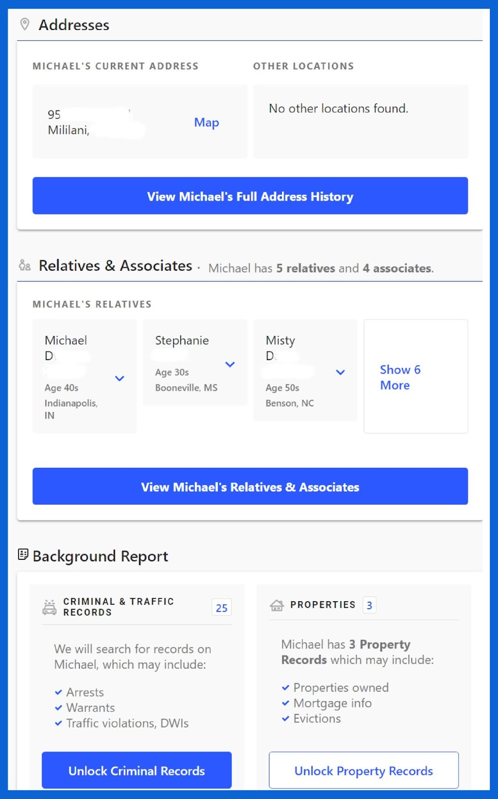 Trong một số trường hợp, trang web/ứng dụng có thể tạo ra kết quả chi tiết hơn. Trong trường hợp đó, bạn có thể thấy tên được liên kết với số điện thoại và các chi tiết như địa chỉ, tuổi của người đó, các số điện thoại khác có thể liên quan đến cùng một người, họ hàng … Tuy nhiên, nếu bạn cần thêm thông tin về hồ sơ tư pháp và lý lịch của họ, những thông tin đó sẽ chỉ được cung cấp sau khi trả phí.