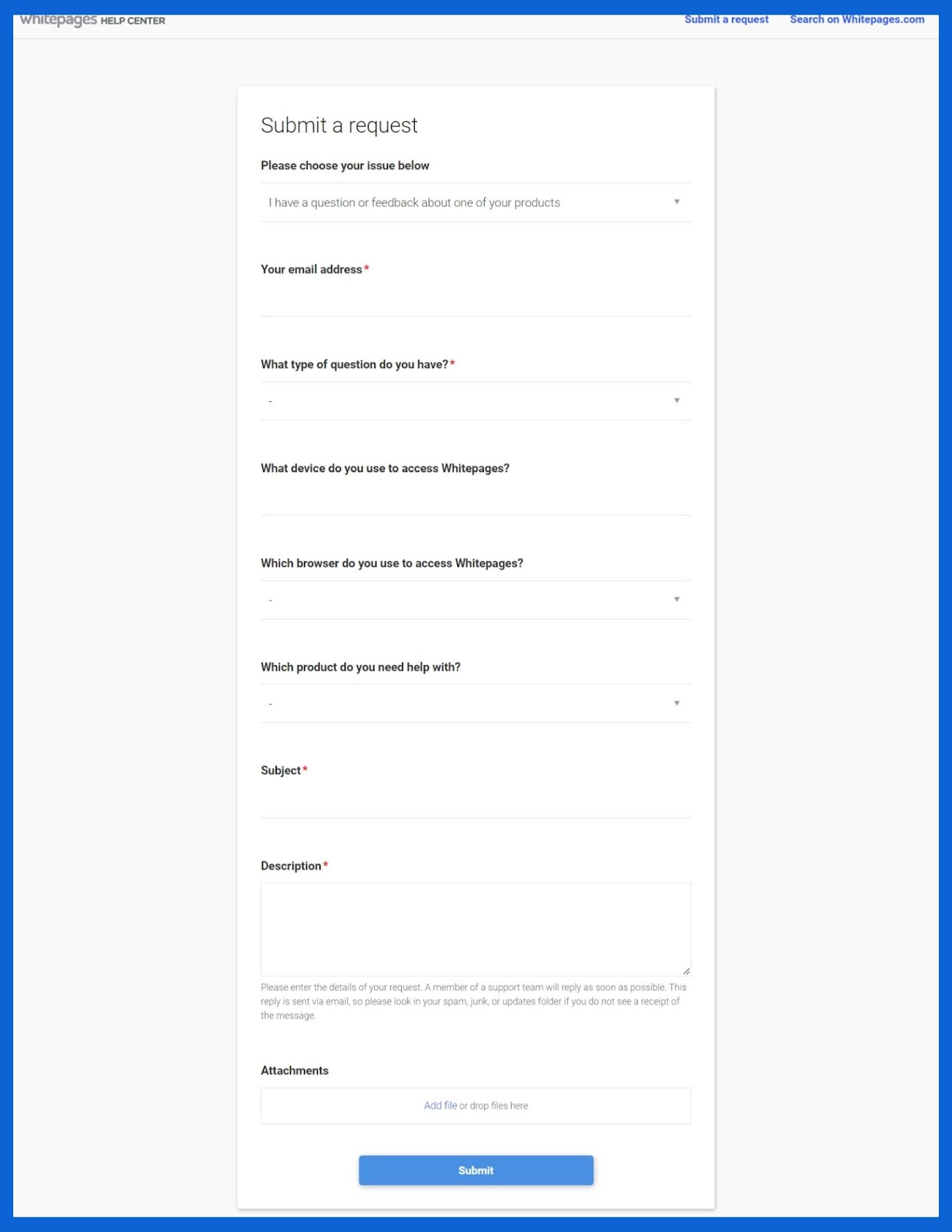 Bạn có thể kết nối với bộ phận hỗ trợ khách hàng của Whitepages bằng cách điền vào mẫu form yêu cầu trên trang web của họ. Họ không cung cấp live chat hoặc hỗ trợ khách hàng tức thì.