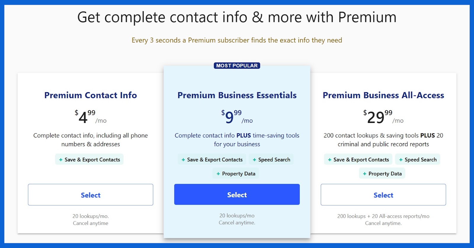 Với $4.99/tháng, đây là mức phí thấp nhất của họ. Gói này bao gồm thông tin danh bạ đầy đủ cộng với tất cả các số điện thoại và địa chỉ. Bạn cũng có thể lưu và xuất danh bạ. Tuy nhiên, nó bị giới hạn ở 20 lần tra cứu mỗi tháng. Khi bạn chọn option này, nó sẽ cung cấp cho bạn hai chu kỳ thanh toán để chọn. Bạn có thể trả $4.99/tháng hoặc trả trước trong 12 tháng chỉ với $29.99, tương đương $2.50 mỗi tháng.