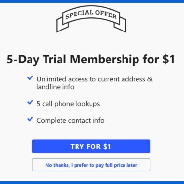 Whitepages cũng cung cấp membership dùng thử 5 ngày với phí $1, cho phép bạn truy cập không giới hạn vào thông tin như địa chỉ hiện tại và thông tin điện thoại cố định. Membership dùng thử không bao gồm các tính năng bổ sung. Nó chỉ bao gồm 5 tra cứu điện thoại di động, không cho bạn nhiều không gian để kiểm tra dịch vụ của họ.