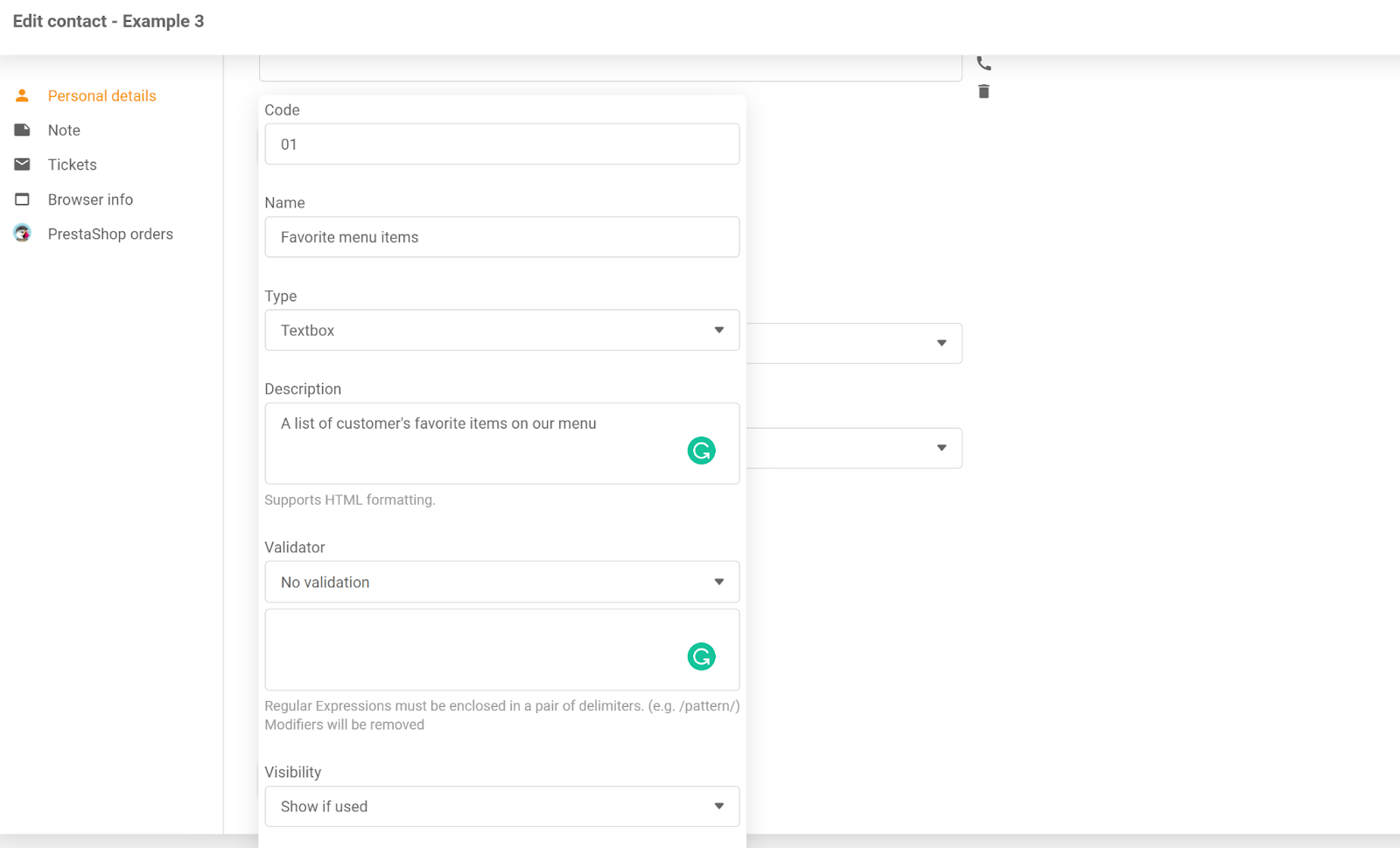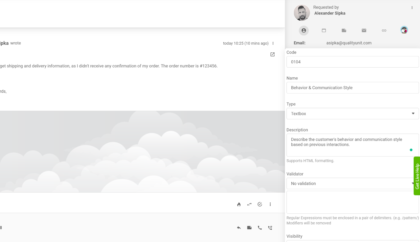 Một trong những tính năng tùy chỉnh tốt nhất cho danh bạ và công ty là các trường tùy chọn. Tính năng này cho phép mỗi người dùng tùy chỉnh chi tiết contact của họ. Bạn có thể thêm một số trường tùy chỉnh, đặt tên cho chúng và điền thông tin bạn cần. Tính năng này hữu ích cho mọi loại hình doanh nghiệp vì nó cho phép bạn phân loại khách hàng theo tiêu chí do chính mình chọn. Cho dù đó là các thông tin chung chung như dữ liệu về quốc gia, hoặc kích thước giày của khách hàng, bạn đều có thể lưu trữ nó trong thông tin danh bạ. Bạn có thể tùy chỉnh trường thông tin theo kiểu ô đánh dấu, trường văn bản, danh sách và nhiều kiểu khác. LiveAgent cũng cho phép bạn thiết lập trạng thái hiển thị của dữ liệu này.