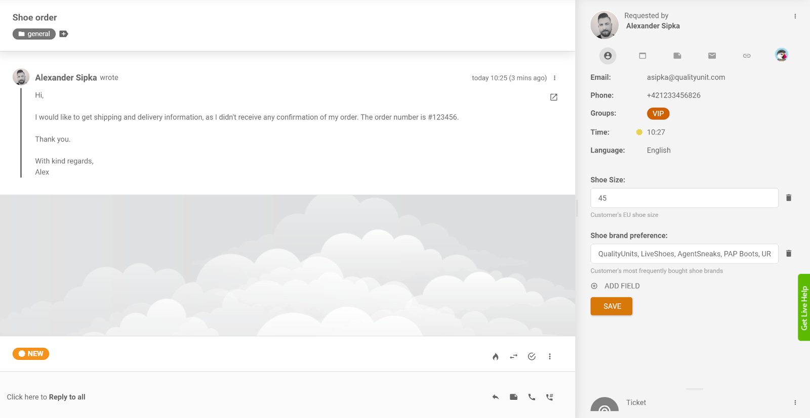 Các tính năng quản lý quan hệ khách hàng hoạt động rất tốt trong LiveAgent. Khi nhận được ticket từ một khách hàng, bạn có thể thấy tất cả thông tin cần thiết trong bảng điều khiển bên phải trong giao diện ticket. Nó bao gồm tất cả dữ liệu đã lưu trước đó để bạn có thể điều chỉnh câu trả lời của mình cho phù hợp. Vì các trường dữ liệu có thể tùy chỉnh, chúng cũng hữu ích như bạn muốn. Điều này cũng mang lại cho bạn cơ hội liên tục thu thập thông tin quan trọng mới từ tương tác của mình với khách hàng. Bạn thậm chí không cần phải rời trang ticket để thực hiện điều này.