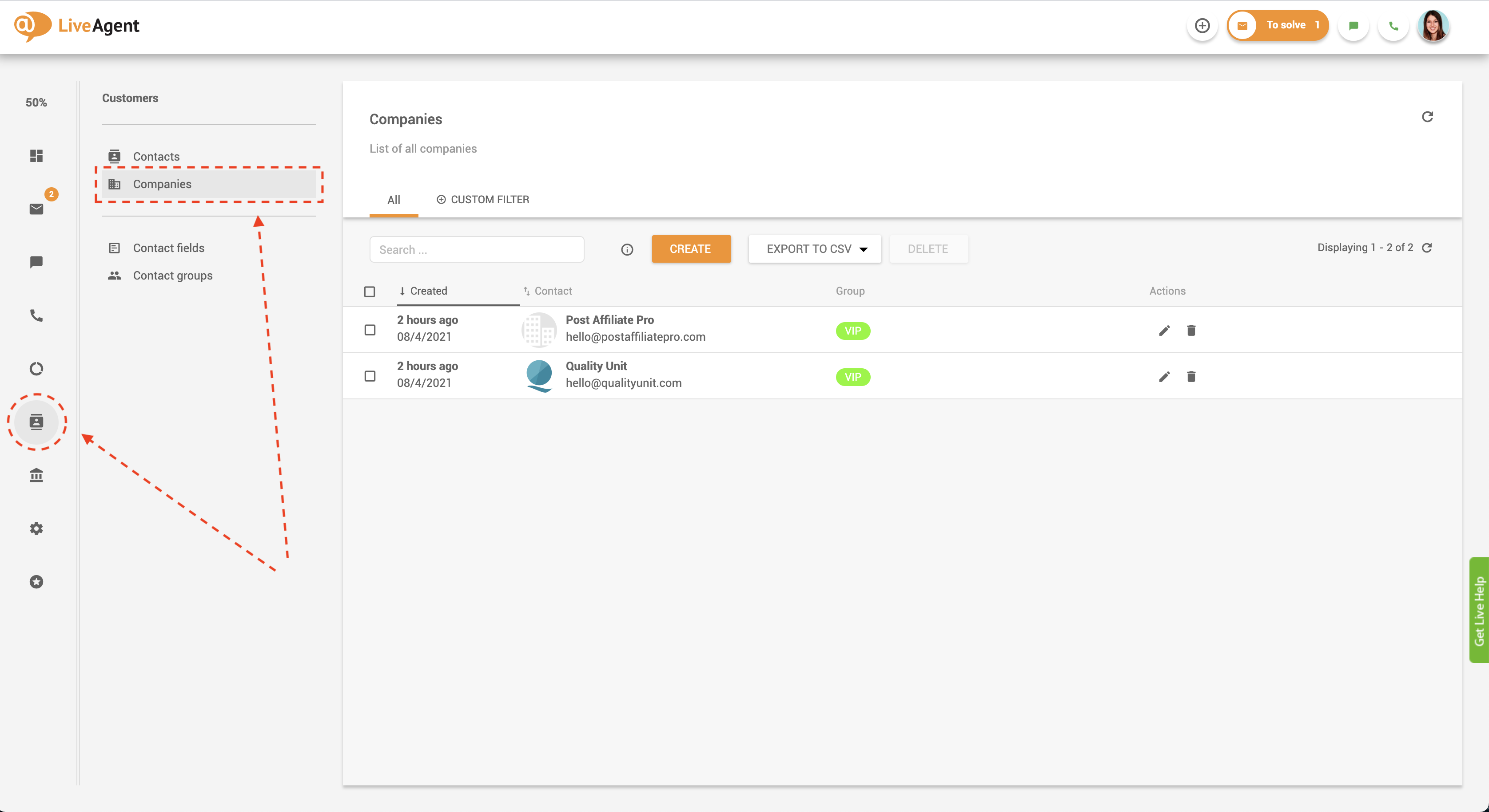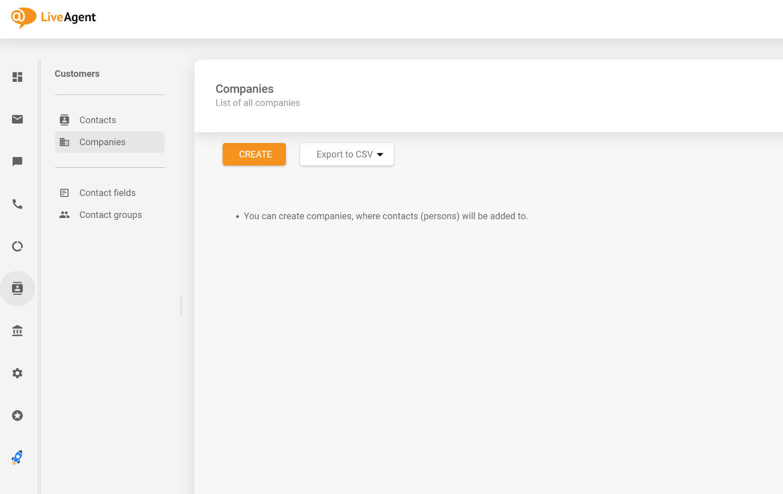LiveAgent có thể thu thập và lưu trữ thông tin liên hệ của các công ty khác nhau. Giao diện người dùng hoạt động chính xác như trong phần contact, với hầu hết cùng loại thông tin có sẵn. Bạn có thể dễ dàng truy cập thông tin về công ty vào bất kỳ thời điểm nào, và chỉnh sửa chúng theo sở thích của mình.
