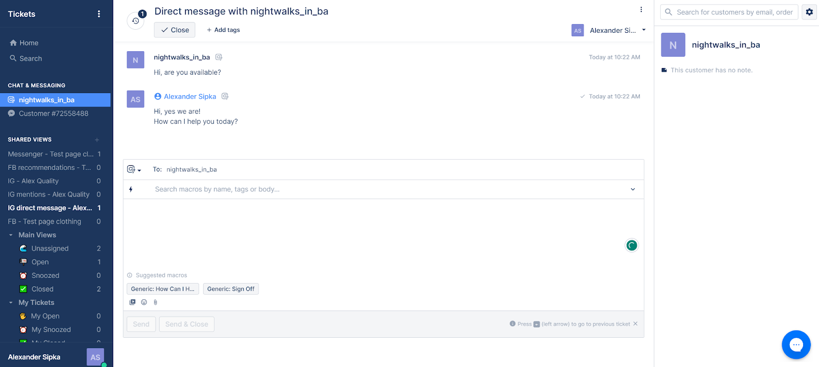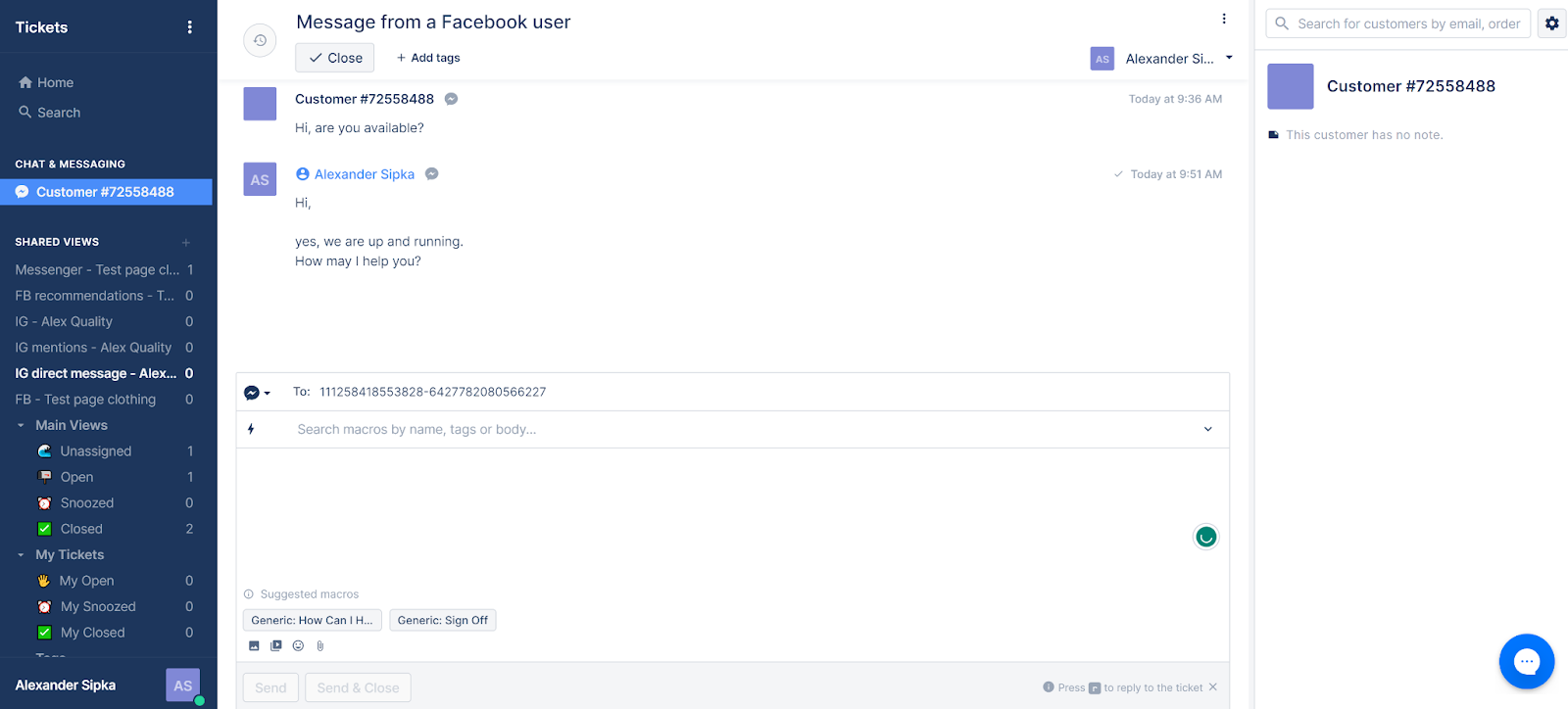 Điều đầu tiên tôi đã thử là gửi một tin nhắn qua Messenger, và tôi rất vui mừng khi thấy nó được gửi đến hệ thống quản lý ticket tức thì, chỉ trong giây lát. Phần trả lời hoạt động rất tốt, bạn có thể sử dụng các tính năng như file đính kèm, biểu tượng cảm xúc, hoặc gửi video và hình ảnh. Tôi đánh giá cao việc hộp thư trả lời cũng cung cấp gợi ý macro giúp trả lời nhanh chóng hơn.