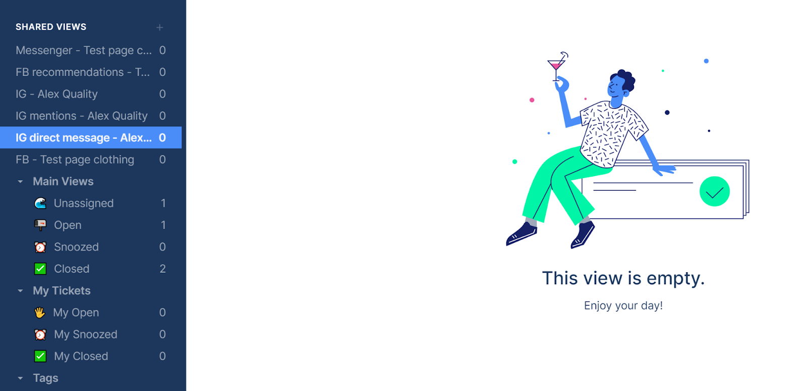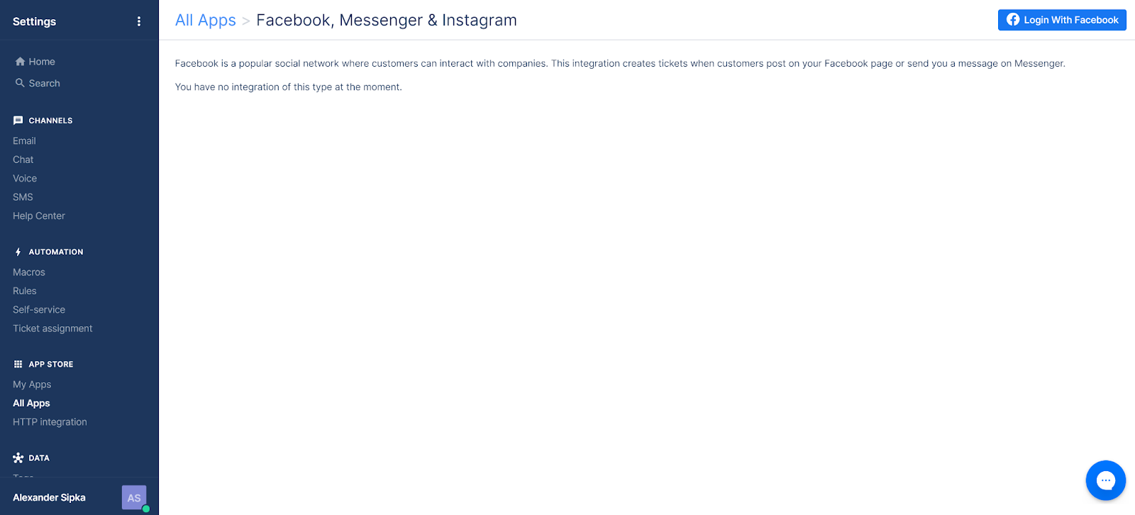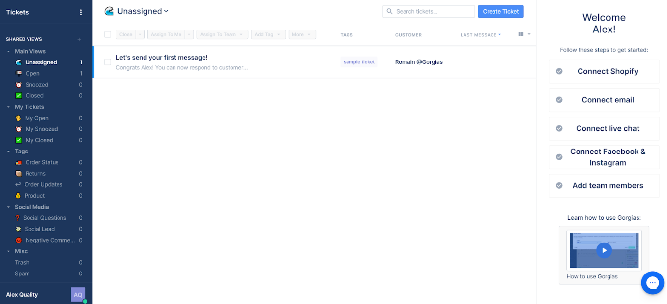 Màn hình chính là hệ thống quản lý ticket, giúp tập trung dễ dàng vào các tác vụ hiện tại. Gorgias có giao diện tập trung, đây là điều tuyệt vời đối với một hệ thống quản lý và CSKH trên mạng xã hội. Tôi có thể truy cập tất cả các danh mục quản lý ticket trong bảng điều khiển bên trái, trong khi màn hình chính tập trung vào phần tác vụ hiện tại. Bảng điều khiển bên phải phục vụ như một hướng dẫn setup tiện lợi cho các kênh khác nhau, bao gồm Facebook & Instagram.