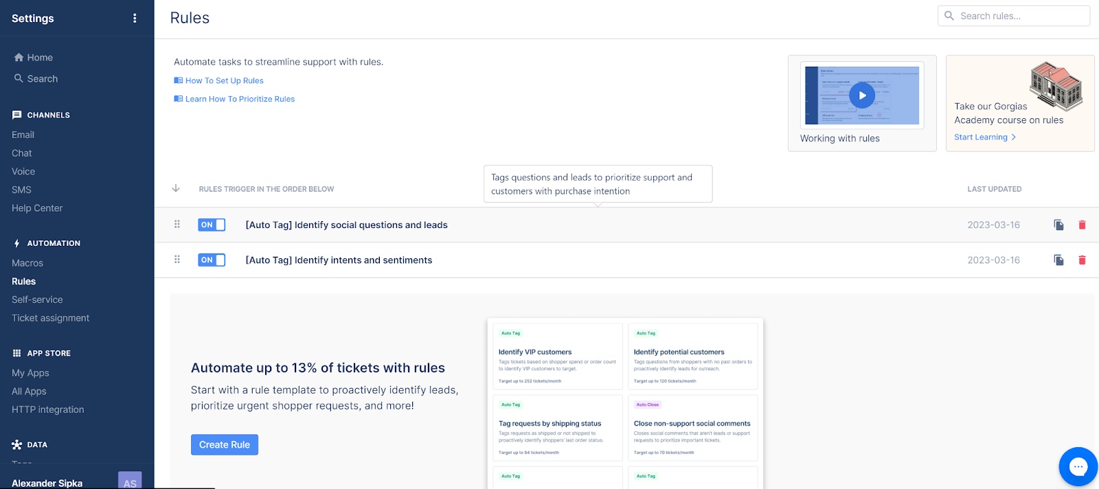 Một điều mà tôi chưa thể thử ngay cả với phiên bản dùng thử miễn phí là tích hợp Twitter. Nó chỉ có trong các gói phí cao hơn, nhưng dựa trên kinh nghiệm với Facebook và Instagram, tôi cho rằng nó sẽ hoạt động hiệu quả. Gorgias cũng cung cấp các tập lệnh macro để tạo ra các câu phản hồi tự động dễ dàng và các workflowkhác, các quy tắc để cải thiện việc sắp xếp tổ chức các ticket và nhiều hơn nữa, cũng như setting phân công ticket.
