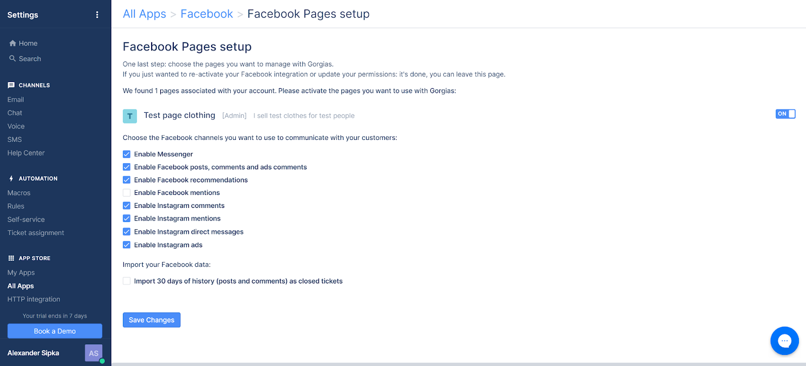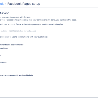 Một khi click vào phần setup mạng xã hội, giao diện rất đơn giản với chỉ một giải thích ngắn về cách thức tích hợp hoạt động như thế nào, và tùy chọn đăng nhập bằng Facebook. Quá trình này rất đơn giản và tôi đã hoàn thành mà không gặp bất kỳ vấn đề nào. Một phần lớn của việc setup là tùy chọn quyết định các bộ phận Facebook của bạn sẽ được Gorgias thu thập vào hệ thống của bạn. Bạn có thể kích hoạt bình luận, đề cập, tin nhắn Messenger, và nhiều hơn nữa trong phần này của cài đặt.