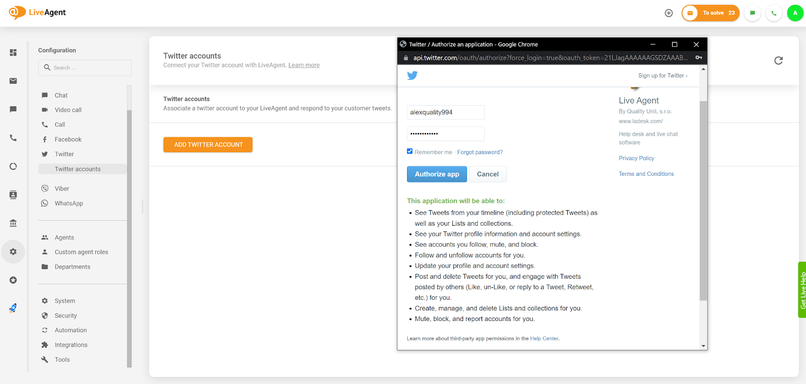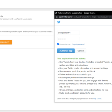 Chỉ như vậy. Việc kết nối Facebook cực kỳ dễ dàng và chỉ mất chưa đầy một phút. Bước tiếp theo là tìm hiểu xem việc tích hợp Twitter có dễ dàng như vậy không. Tùy chọn này có sẵn trong cùng phần menu trong Settings của LiveAgent. Bạn chỉ cần thêm tài khoản của mình và trao quyền cho LiveAgent, giống như bước trước. Quá trình này sẽ khiến bạn mất ít thời gian hơn so với việc tích hợp Facebook.