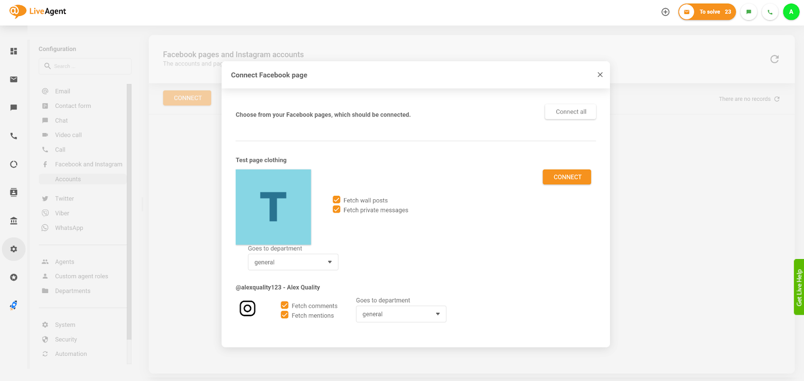 LiveAgent cũng cung cấp tích hợp Instagram. Vì lý do nào đó, nó không hiển thị trong menu bên trái, nhưng bạn có thể tìm thấy nó trong Settings, trong mục Plugins. Sau khi kích hoạt Plugin, bạn có thể thấy phần menu Facebook bên trái sẽ tự động cập nhật lên Facebook và Instagram. Khi vào phần này, bạn cần thêm tài khoản khác bằng cách nhấn vào nút Connect. Bạn cần đảm bảo rằng tài khoản Instagram của bạn được kết nối với Facebook và bạn đã thiết lập tài khoản này làm tài khoản chuyên nghiệp.
