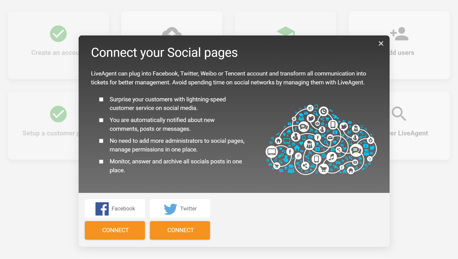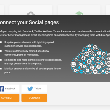 Hướng dẫn này có thể hướng dẫn bạn toàn bộ quá trình thiết lập tài khoản LiveAgent của mình. Bạn có thể thêm email, thiết lập chat và tổng đài cuộc gọi cũng như thêm tài khoản mạng xã hội của mình theo từng bước riêng biệt thể hiện trên màn hình. Việc chọn công cụ nào bạn muốn sử dụng trước tiên chỉ tùy thuộc vào bạn (và gói phí của mình). Bạn có thể chọn option mạng xã hội ngay lập tức và bắt đầu thêm tài khoản của mình vào hệ thống quản lý ticket.