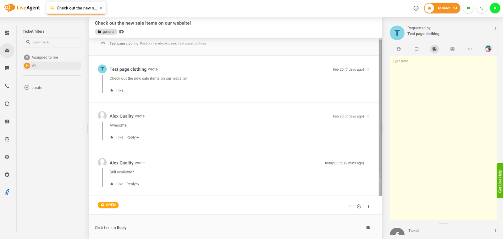 Việc thử nghiệm các kênh và tính năng mạng xã hội trong LiveAgent là một điều thú vị. Tôi đã sử dụng các tài khoản mạng xã hội thử nghiệm của mình để mô phỏng trải nghiệm từ vị trí nhân viên và tôi rất vui khi nói rằng tất cả chúng đều hoạt động tốt. Đầu tiên, tôi viết nhận xét về trạng thái trang Facebook business của mình để tìm hiểu xem việc tích hợp có hoạt động bình thường hay không. Bình luận đến trong vòng vài giây và xuất hiện dưới dạng một ticket trong hộp thư hợp nhất của tôi.