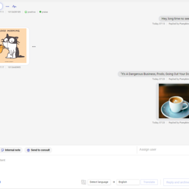 Phản hồi thực sự nhanh chóng trong giao diện của nhân viên, cũng như của khách hàng. Ngoài việc gửi text chữ thuần túy, bạn có thể sử dụng GIF và các biểu tượng emoji (cảm xúc) cũng như thêm ảnh và file từ máy tính của mình. Ngoài ra, bạn có thể thêm ghi chú nội bộ vào từng cuộc trò chuyện và gửi tương tác qua email để được tư vấn bằng nút Send to consult. Bạn có thể chỉ định người dùng tương tác hoặc hệ thống tự động thực hiện việc này giúp bạn. Tôi nhận thấy nó rất tương đồng với một hệ thống quản lý ticket.
