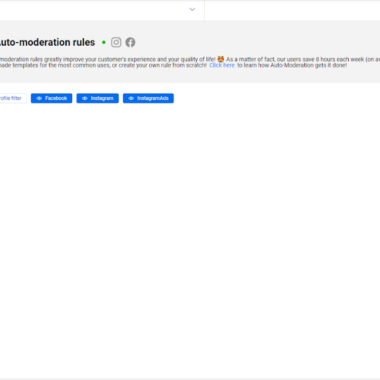 Click vào Auto-moderation (Tự động kiểm duyệt) trong menu bên trái, bạn có thể thiết lập tự động hóa cho các hồ sơ mạng xã hội của mình. NapoleonCat cho phép bạn cấu hình các quy tắc tự động hóa từ đầu hoặc bạn có thể sử dụng một trong các template tạo sẵn.