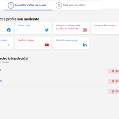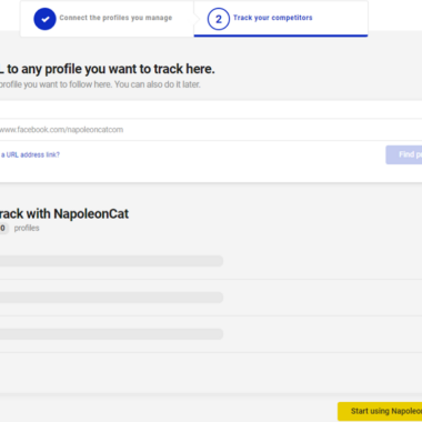 Từ đó, bước thứ hai mà NapoleonCat gợi ý là theo dõi các đối thủ cạnh tranh của tôi. Để làm mẫu, tôi đã chọn trang Facebook của chính NapoleonCat. Sau đó, tôi nhấn nút Start using NapoleonCat.