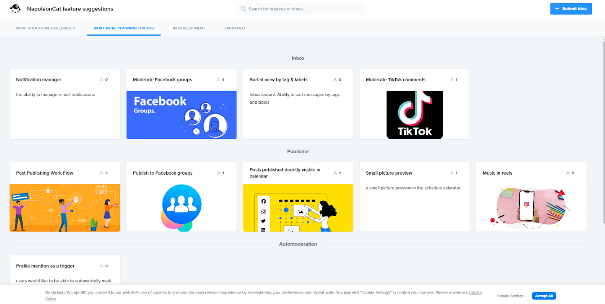 Tính năng cuối cùng tôi muốn đề cập là phần đề xuất các tiện ích của NapoleonCat. Tại đây, bạn có thể xem những tính năng nào đang được phát triển và bạn có thể đề xuất những gì mình muốn chúng thêm vào, cũng như những tính năng đã được khởi chạy. Tôi thích sự minh bạch này, làm cho khách hàng của NapoleonCat cảm thấy mình là một phần trong quy trình xây dựng phần mềm.