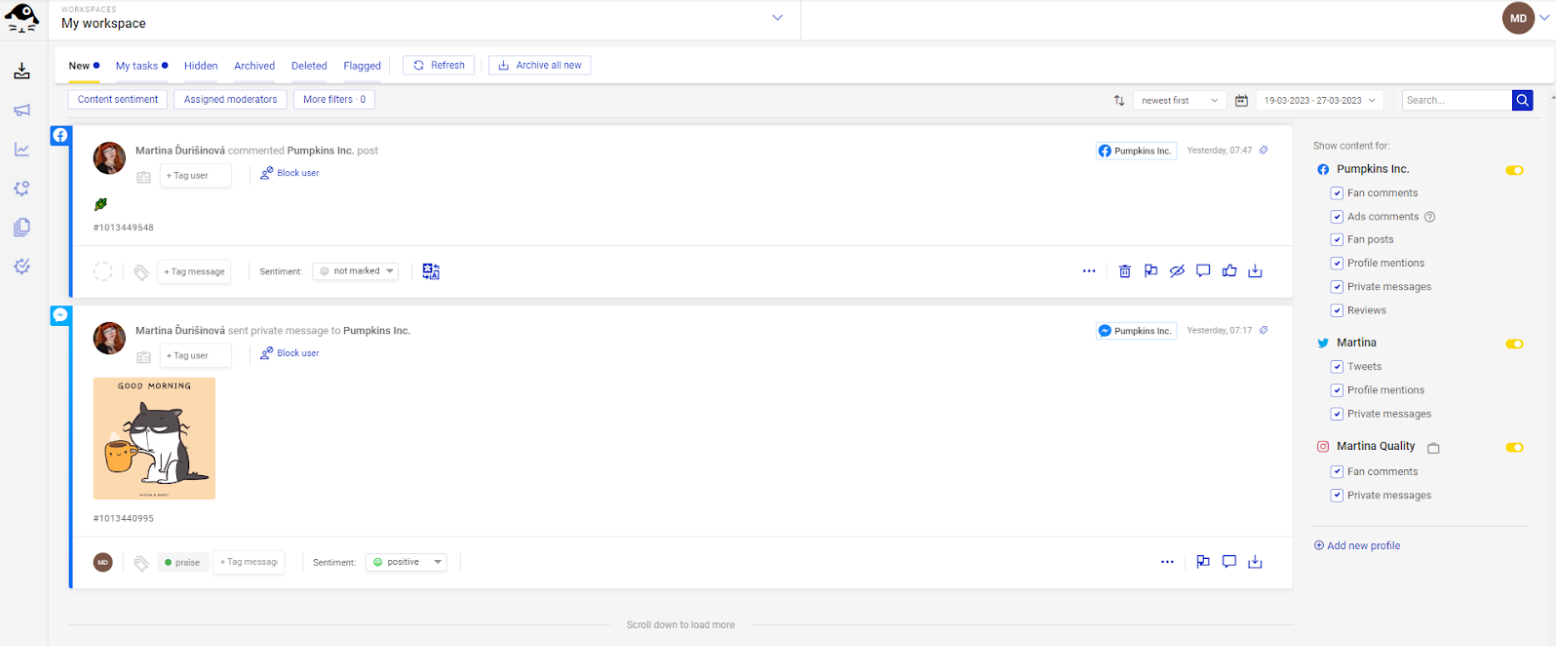 Phần mềm của NapoleonCat phản ứng rất tốt. Tôi đã có một subscriber mẫu viết tin nhắn cho doanh nghiệp của mình và tương tác lại một bài đăng trên Facebook. Những tương tác này ngay lập tức xuất hiện trong giao diện của NapoleonCat.