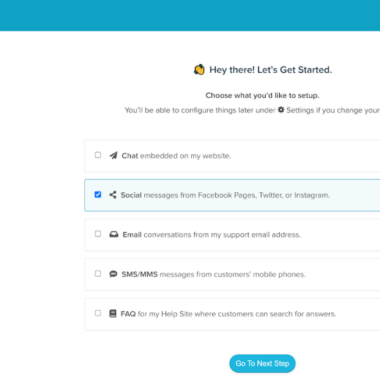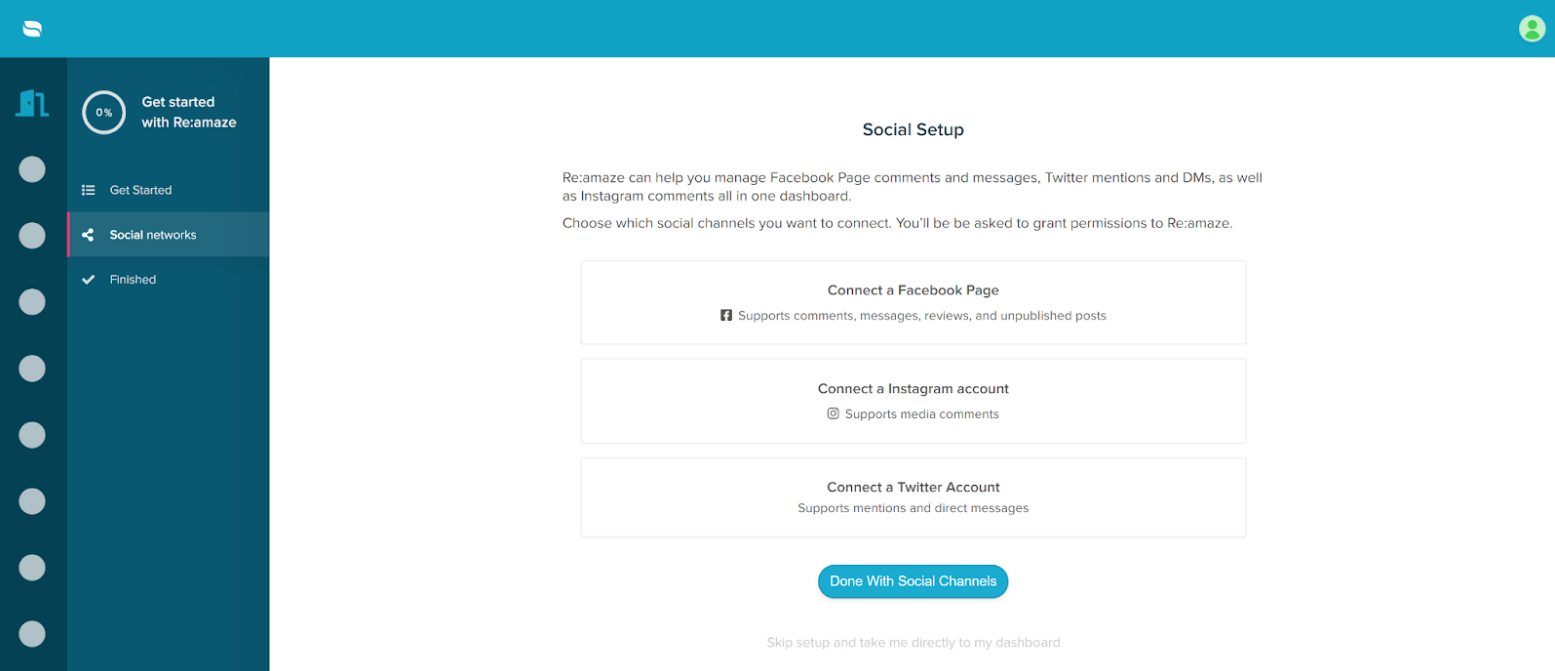 Re:amaze cho phép bạn dùng thử miễn phí, vì vậy không cần phải đăng ký liền. Khi nhập thông tin chi tiết của mình vào form đăng ký, Re:amaze sẽ giúp bạn thiết lập những gì cần thiết. Nó cung cấp cho tôi các option thiết lập chat, email, SMS/MMS, Câu hỏi thường gặp hoặc mạng xã hội. Tôi đã chọn option mạng xã hội, vì đây là những gì chúng ta sẽ tập trung vào trong bài review này. Ngoài ra còn có option bỏ qua hoàn toàn phần setup này.