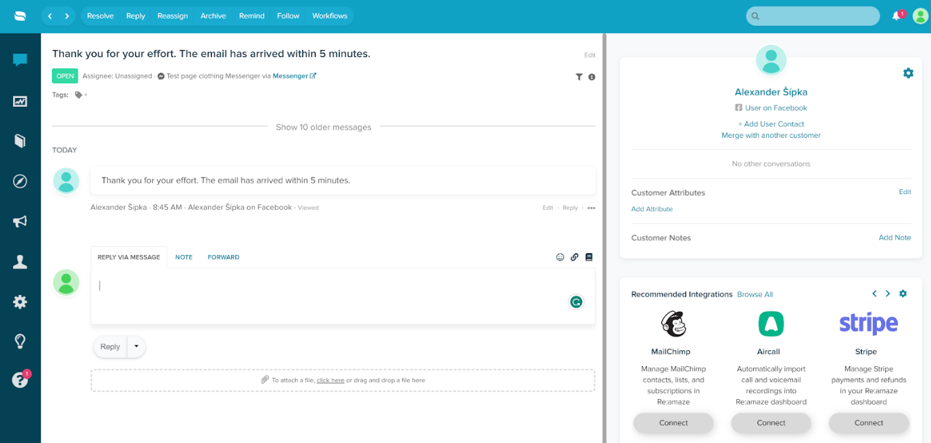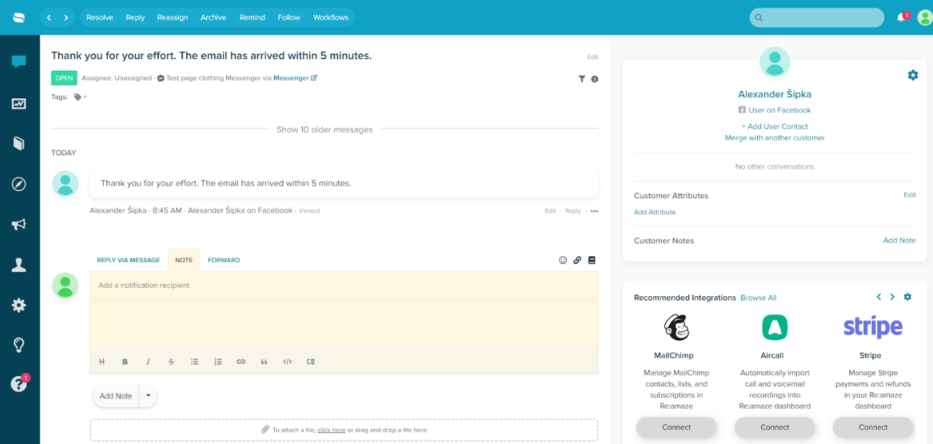 Lúc đầu, làm việc với Re:amaze còn chưa quen. Đây là một hệ thống tuyệt vời, dường như mọi thứ hoạt động một cách hoàn hảo. Vấn đề đầu tiên tôi nhận thấy là không nhận được bất kỳ thông báo nào về tin nhắn Messenger được gửi đến. Tôi đã phải refresh lại hệ thống và tìm kiếm bất kỳ thông báo nào trong inbox theo cách thủ công. Sau khi tìm thấy, mọi thứ trở nên tốt hơn với giao diện bên trong ticket. Sau đó, tôi phát hiện ra bạn cần kích hoạt thông báo theo cách thủ công, điều này khá kỳ lạ. Theo tôi thì chức năng này hoạt động tốt.