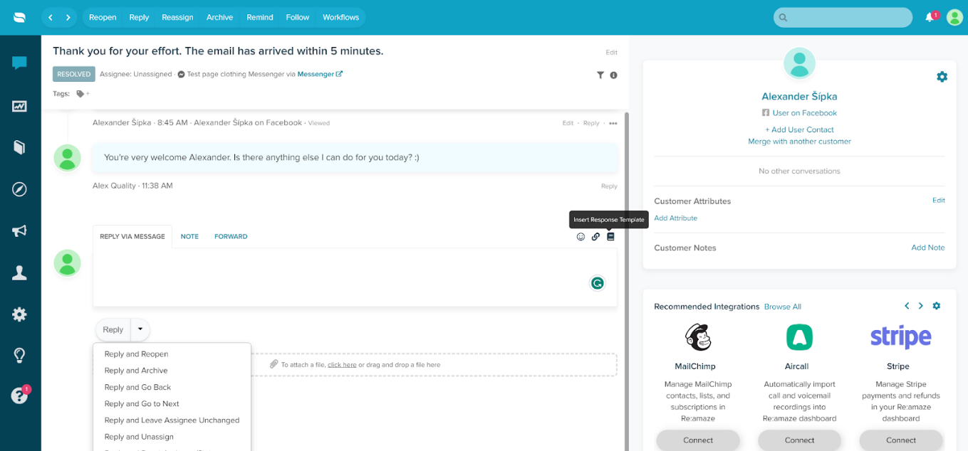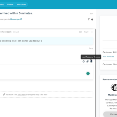Trải nghiệm trả lời khá thú vị. Tôi có thể click chuột để thêm file và tệp đính kèm hoặc kéo thả chúng thẳng vào tin nhắn. Tôi cũng có thể chèn template phản hồi, biểu tượng cảm xúc và chọn thay đổi trạng thái sẽ được áp dụng khi trả lời tin nhắn. Đây không phải là bộ tính năng phong phú nhất mà tôi từng thấy trong hệ thống quản lý ticket trên mạng xã hội, nhưng nó cung cấp hầu hết mọi thứ bạn cần để giao tiếp hiệu quả.