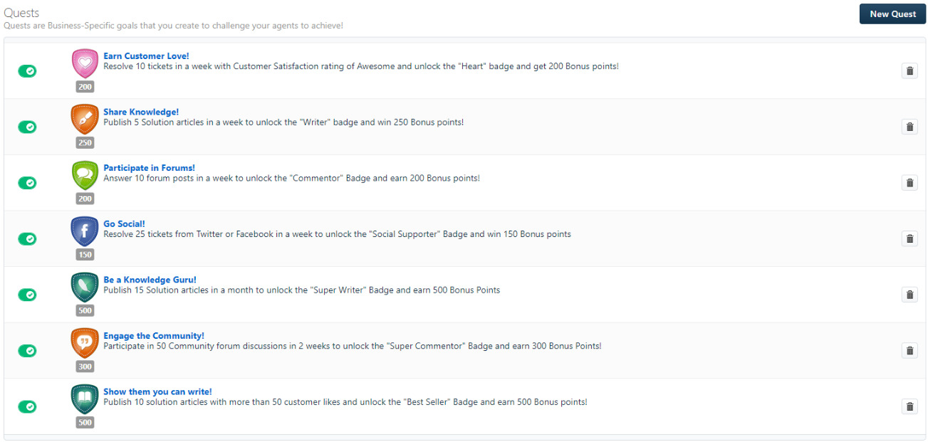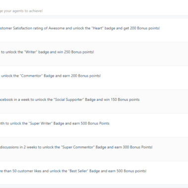 Với nhiệm vụ, bạn có thể thiết lập mục tiêu hiệu suất cho nhân viên hỗ trợ và điều chỉnh chúng cho phù hợp với mục tiêu kinh doanh của mình. Những nhiệm vụ này sẽ thúc đẩy các nhân viên của bạn thực hiện các hoạt động có lợi cho thương hiệu của mình cũng như nâng tầm kỹ năng hỗ trợ khách hàng của họ. Nhưng đó không phải là tất cả! Khi hoàn thành các nhiệm vụ, nhân viên của bạn có thể kiếm được điểm thưởng và huy hiệu độc đáo sẽ hiển thị trên hồ sơ của họ, thể hiện thành tích của họ. Ngoài ra, việc hoàn thành nhiệm vụ sẽ nâng cao cơ hội giành được danh hiệu hàng tháng và đạt đến vị trí cao mới trên bảng thành tích.