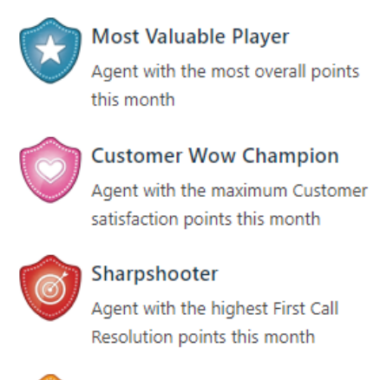 Theo trải nghiệm của mình với các tính năng game hóa của Freshdesk, tôi thấy có 4 danh hiệu riêng biệt được trao cho nhân viên dựa trên các chỉ số hiệu suất của họ. Danh hiệu đầu tiên là the Most Valuable Player được trao cho nhân viên có tổng điểm cao nhất trong tháng hiện tại. Danh hiệu thứ hai là the Customer ‘Wow’ Champion được trao cho nhân viên có điểm số Hài lòng Khách hàng tối đa trong tháng. Danh hiệu thứ ba, được gọi là the Sharpshooter, được trao cho nhân viên có điểm số First Call Resolution cao nhất trong tháng, cho thấy họ có thể giải quyết các yêu cầu hỗ trợ chỉ trong 1 lần tương tác. Danh hiệu thứ tư, the Speed Racer, thuộc về nhân viên có điểm số tối đa trong hạng mục giải quyết nhanh, ghi nhận khả năng giải quyết ticket trong vòng chưa đầy 1 giờ của họ. Điều tuyệt vời ở hệ thống này là bảng thành tích được thiết lập lại vào ngày đầu tiên hàng tháng, mang đến cho mọi người một khởi đầu mới. Với vai trò là nhân viên, bạn có thể xem tên của những người hiện đang dẫn đầu bảng thành tích trực tiếp từ trang dashboard.