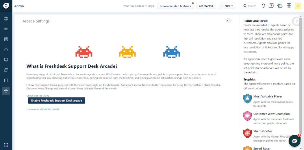 Sau khi hoàn tất, bước tiếp theo là bật Support Desk Arcade của Freshdesk trong phần setting.