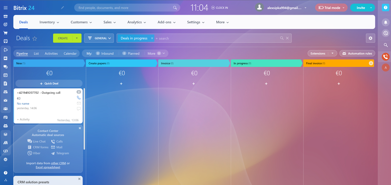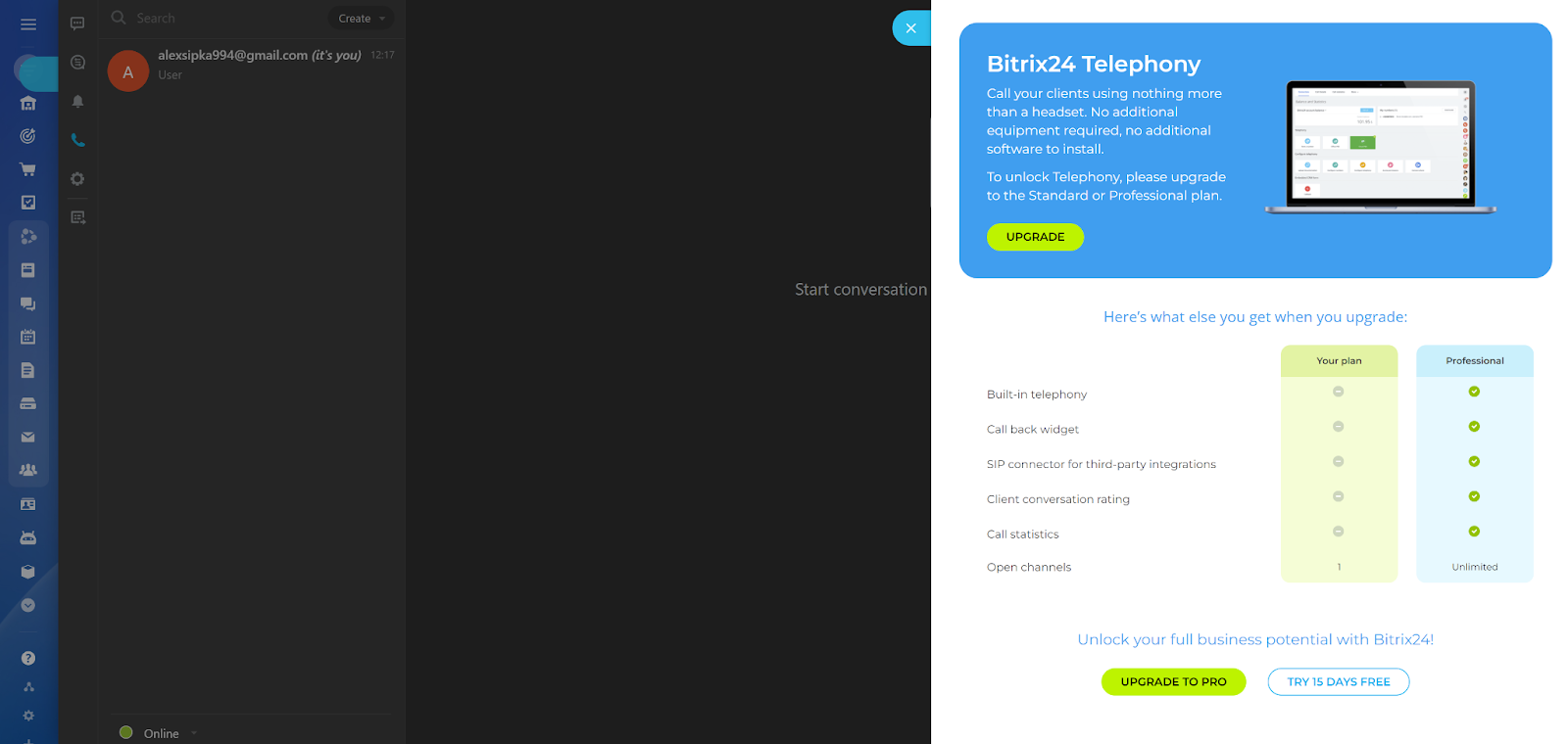 Vì không trả tiền cho bản Bitrix24 nên tôi có thể dùng thử chức năng Telephony với bản dùng thử miễn phí 15 ngày. Sau khi tôi kích hoạt, chức năng Điện thoại sẽ khả dụng ngay tức thì. Tuy nhiên, trước tiên bạn cần mua credit để gọi hoặc thêm số điện thoại của mình. Bitrix24 cung cấp nhiều tùy chọn tích hợp số điện thoại thông qua dịch vụ API, PBX, SIP …. Một số tùy chọn này có thể yêu cầu thanh toán bổ sung, cụ thể là Office PBX và Cloud PBX yêu cầu bạn mua một mô-đun đặc biệt cho các cuộc gọi. Tùy chọn dễ nhất là thuê một số điện thoại. Dù chọn tùy chọn nào, bạn vẫn có thể sử dụng các tính năng của tổng đài cuộc gọi Bitrix24.