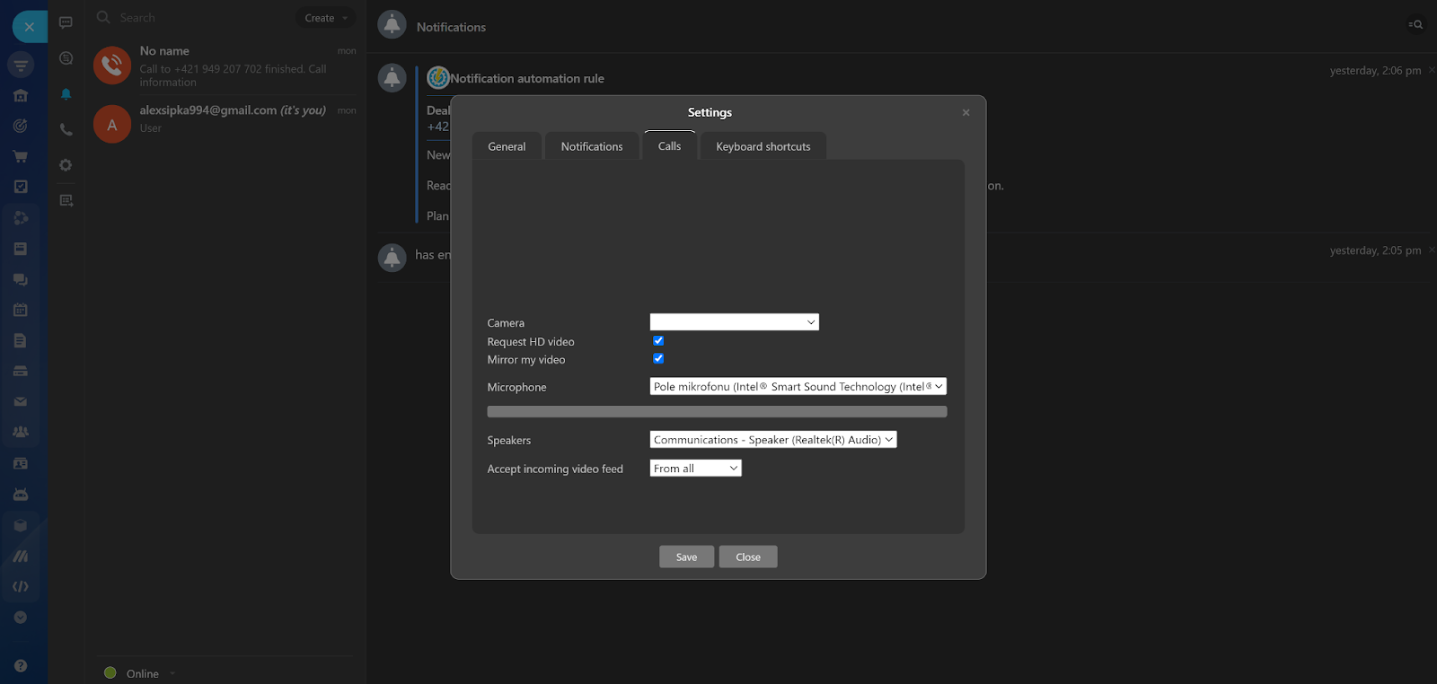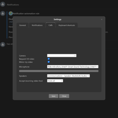 Bạn cũng có thể xem các cuộc gọi trước đây trong phần CRM và phần menu cuộc gọi. Menu này không chỉ cung cấp chức năng điện thoại. Bạn cũng có thể truy cập menu thông báo, kênh và một số tùy chọn cài đặt. Các cài đặt khá ngắn gọn và chúng cho phép bạn điều chỉnh phím tắt, bật hoặc tắt một số tùy chọn tổng đài cuộc gọi nhất định, chọn loa và microphone, điều chỉnh cài đặt nhắn tin …