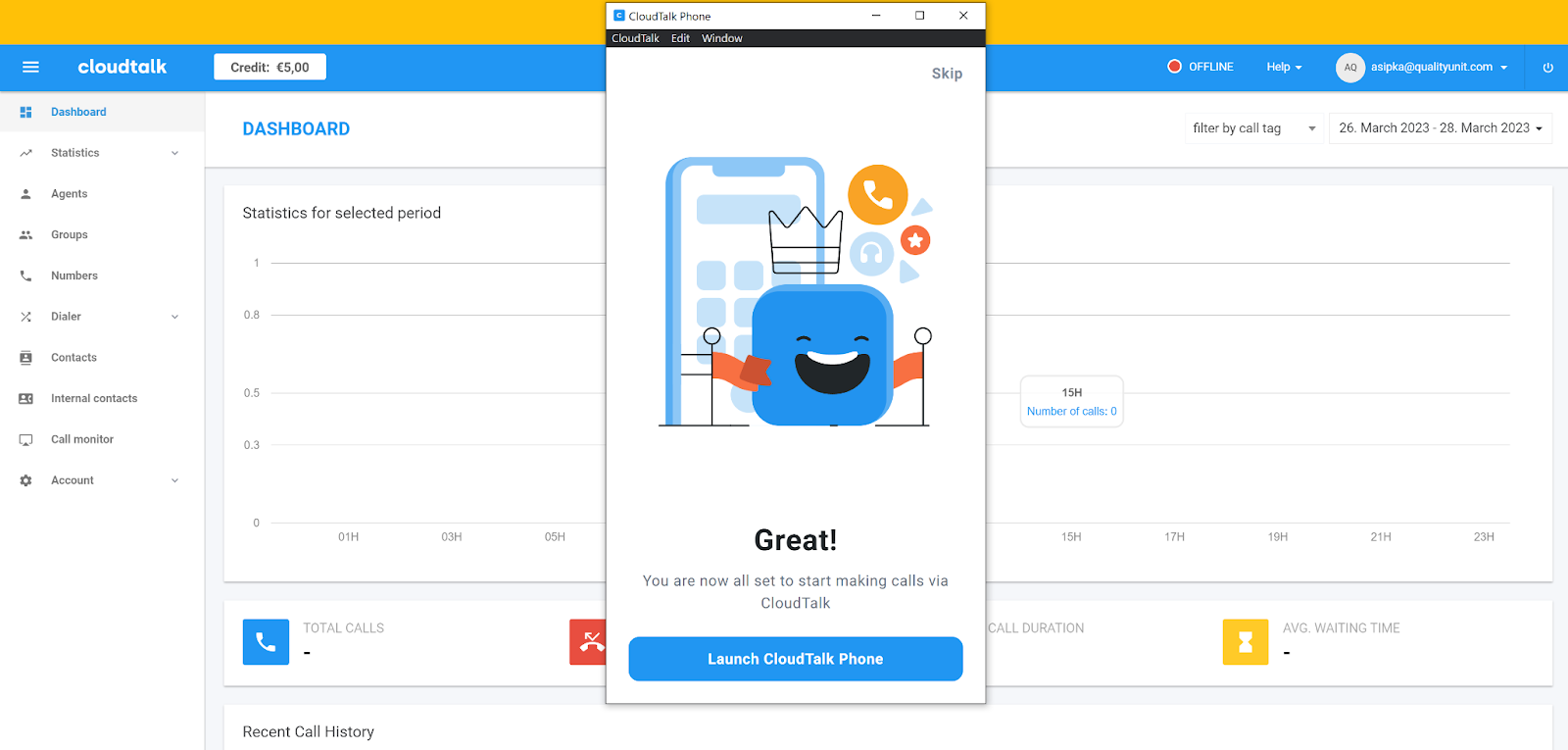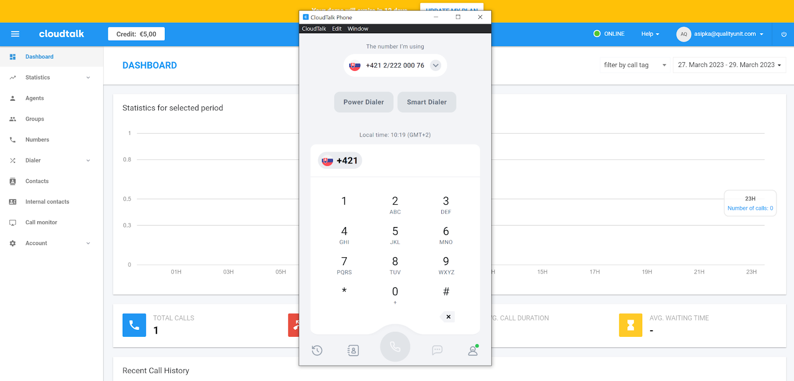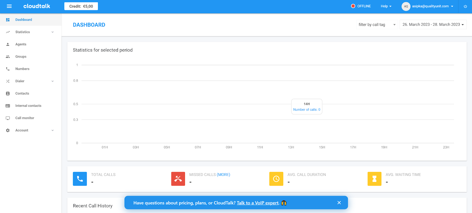 CloudTalk có giao diện rất đẹp với cảm giác hiện đại. Việc điều hướng có vẻ dễ dàng ngay từ đầu, vì vậy bạn sẽ không gặp khó khăn gì khi tìm bất kỳ tùy chọn nào. Trang dashboard chính hiển thị số liệu thống kê trong một khoảng thời gian đã chọn, chẳng hạn như cuộc gọi nhỡ, thời gian chờ trung bình và thời lượng cuộc gọi trung bình. Tất cả các tùy chọn điều hướng đều nằm trong thanh menu bên trái. CloudTalk cũng cung cấp khoản tín dụng $5 để bạn có thể gọi điện. Trải nghiệm người dùng trên ứng dụng CloudTalk cũng tuyệt vời như vậy.