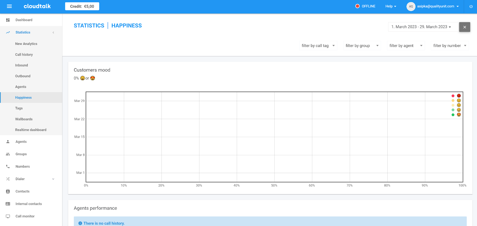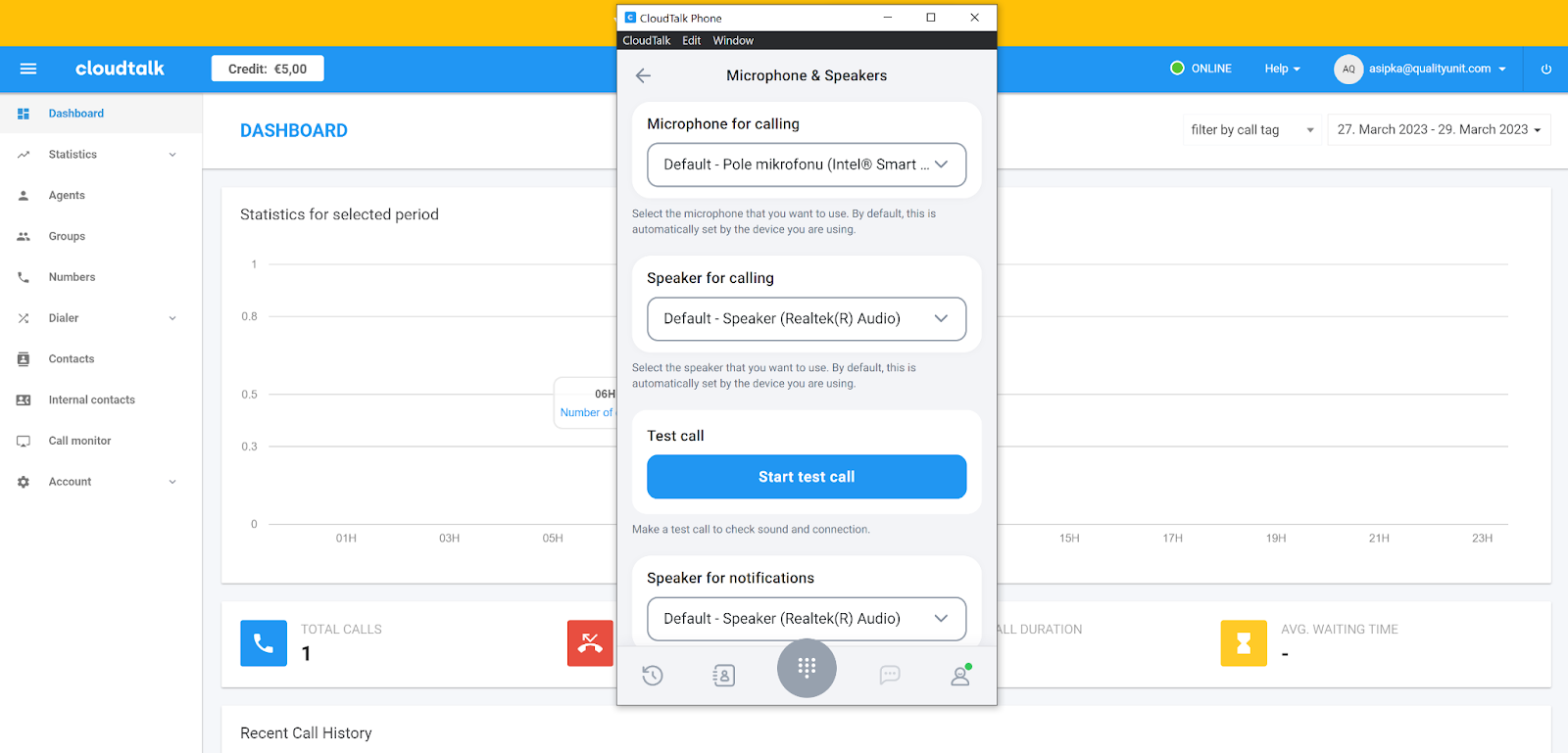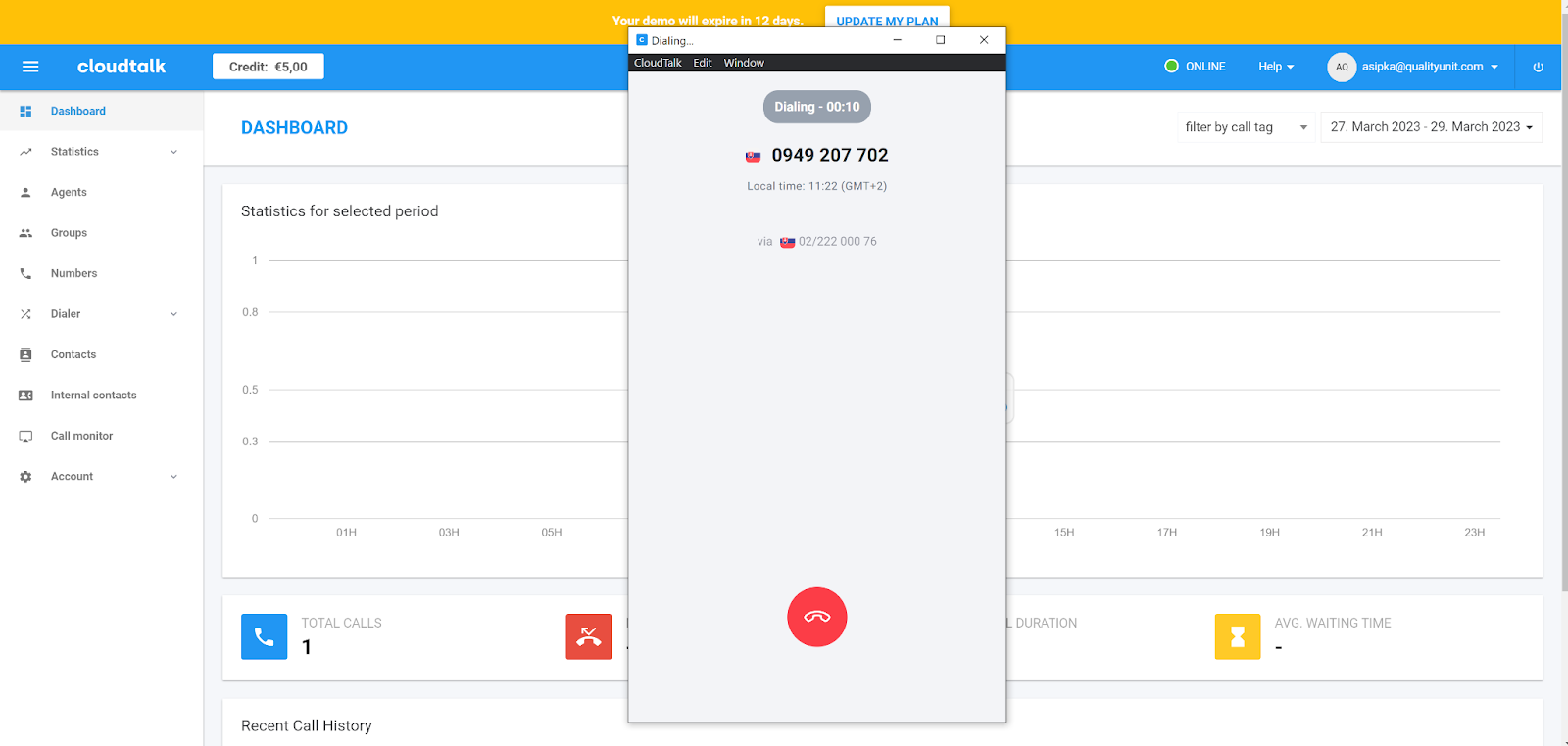 CloudTalk có giao diện rất đẹp với cảm giác hiện đại. Việc điều hướng có vẻ dễ dàng ngay từ đầu, vì vậy bạn sẽ không gặp khó khăn gì khi tìm bất kỳ tùy chọn nào. Trang dashboard chính hiển thị số liệu thống kê trong một khoảng thời gian đã chọn, chẳng hạn như cuộc gọi nhỡ, thời gian chờ trung bình và thời lượng cuộc gọi trung bình. Tất cả các tùy chọn điều hướng đều nằm trong thanh menu bên trái. CloudTalk cũng cung cấp khoản tín dụng $5 để bạn có thể gọi điện. Trải nghiệm người dùng trên ứng dụng CloudTalk cũng tuyệt vời như vậy.