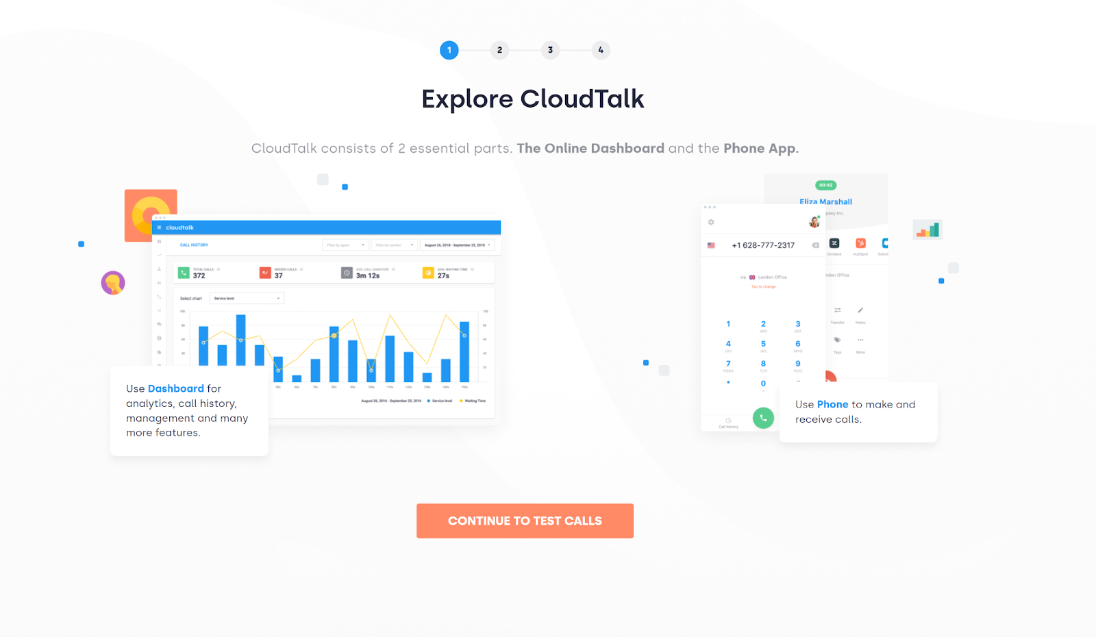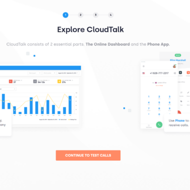 CloudTalk hoạt động rất tốt ngay từ đầu. Nó không chỉ cung cấp cho tôi số điện thoại thử nghiệm mà còn giải thích một cách cẩn thận và đơn giản các bộ phận khác nhau của phần mềm. Nó cũng cho tôi cơ hội trả lời thử cuộc gọi giúp tôi biết cách sử dụng chức năng cuộc gọi. Nói đơn giản là tuyệt vời và tôi đánh giá cao loại hình hướng dẫn này trong mọi loại phần mềm, bất kể chúng là gì. CloudTalk cũng sẽ nhắc bạn tải xuống app điện thoại CloudTalk. Sau khi thiết lập xong, bạn có thể bắt đầu xem phần giao diện.