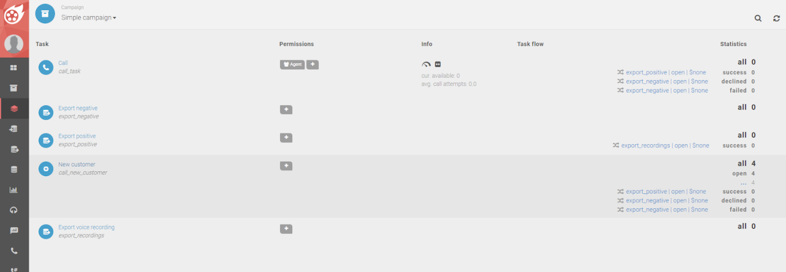 Khi đang tạo các chiến dịch cuộc gọi, Dialfire cho phép bạn cấu hình chúng khá kỹ lưỡng trong phần Tasks. Bạn có thể tạo luồng IVR, xuất bản ghi âm giọng nói … Điều này có thể rất hữu ích trong các tổng đài cuộc gọi lớn khi thiết lập các quy trình.